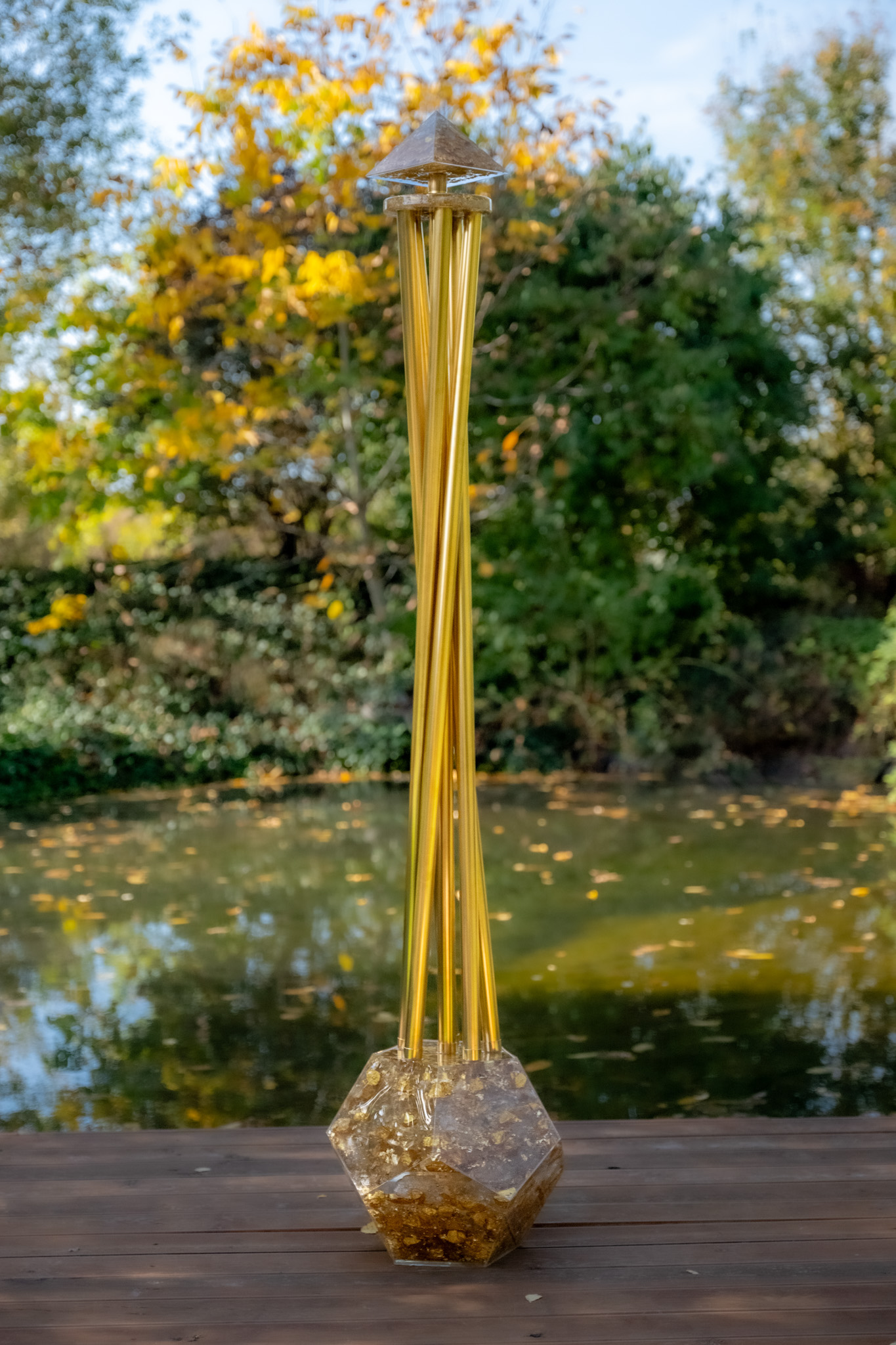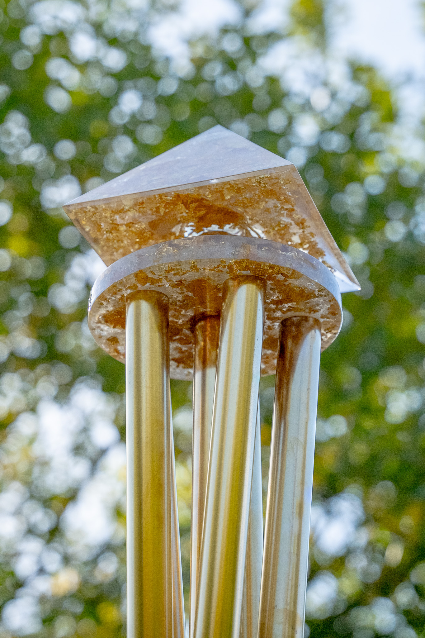 The Akasha Pillar® is built upon a solid orgonite base, featuring seven copper pipes and a Cheops pyramid as its crown.