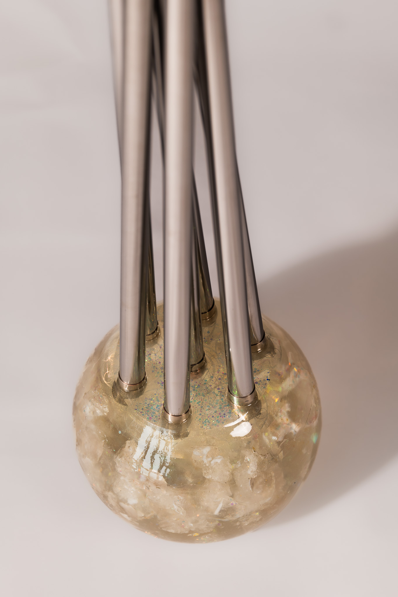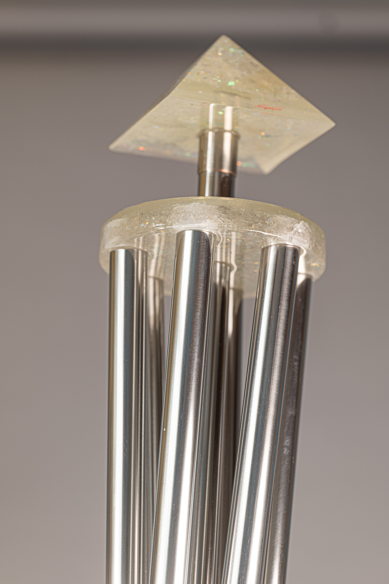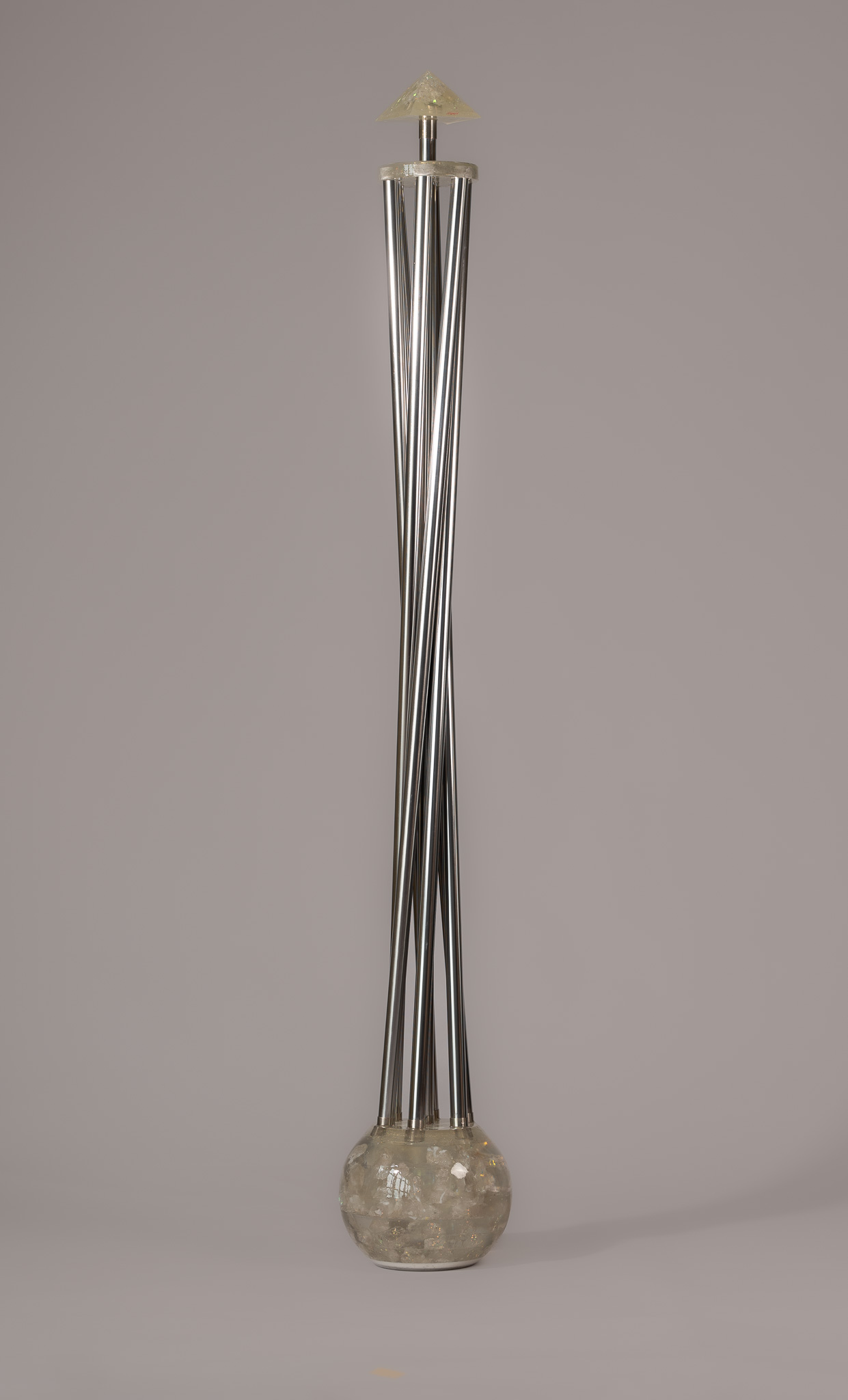 Das Gestänge: Sieben Stangen, die im hexagonalen Muster 1,65 m in den Himmel ragen, ummantelt von wetterfestem Schutz. Die zentrale Stange ist mit beschwungenen Bergkristallspitzen gefüllt.