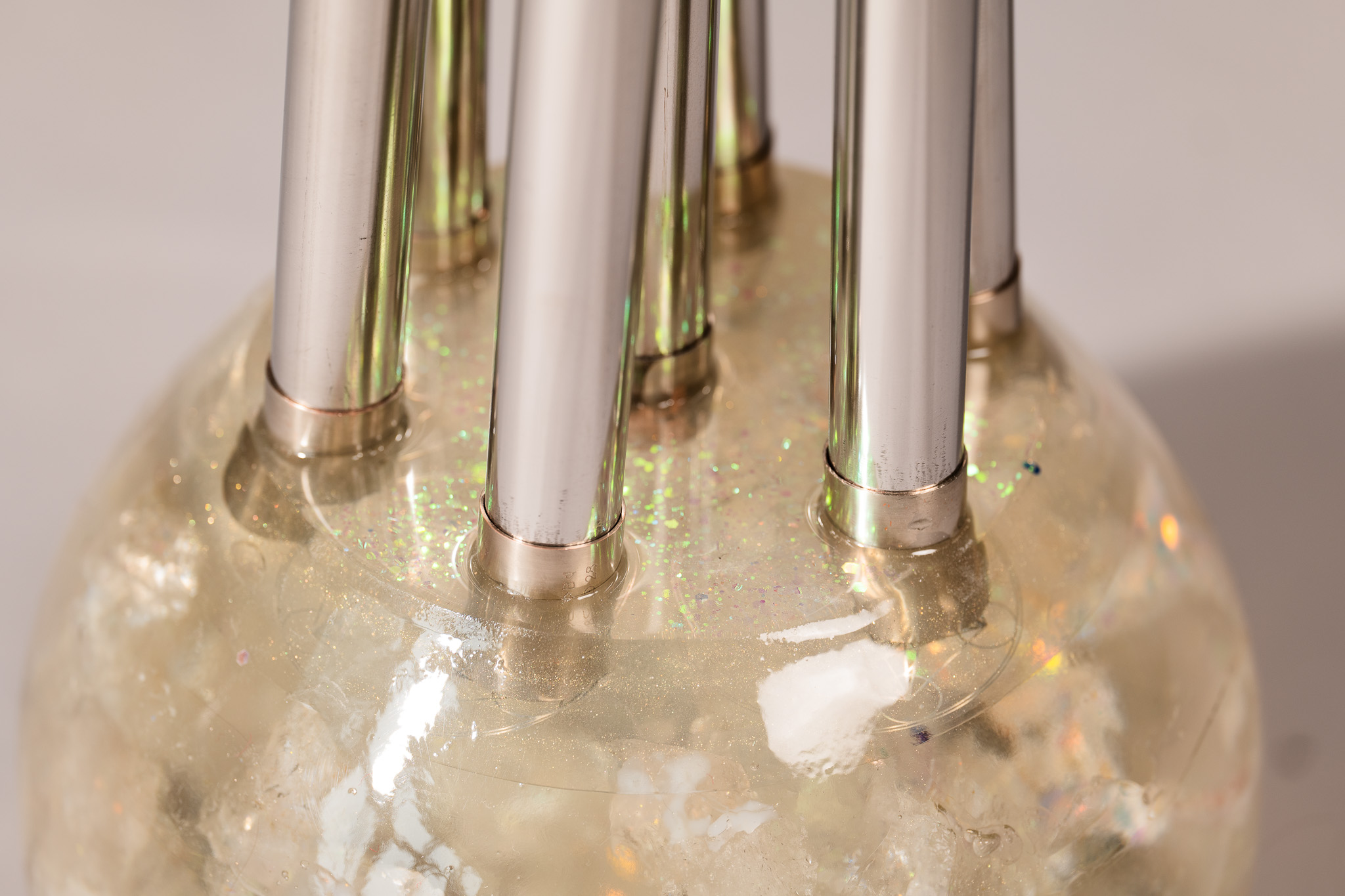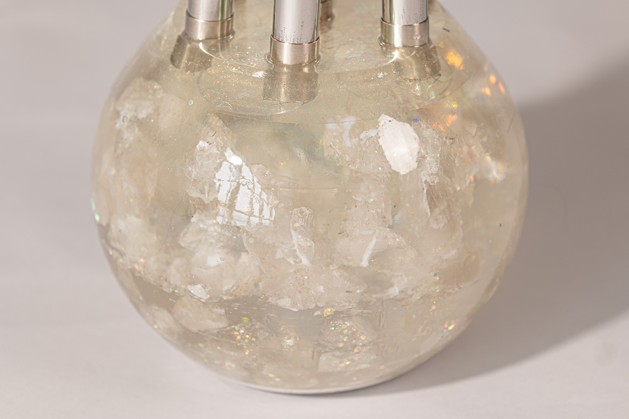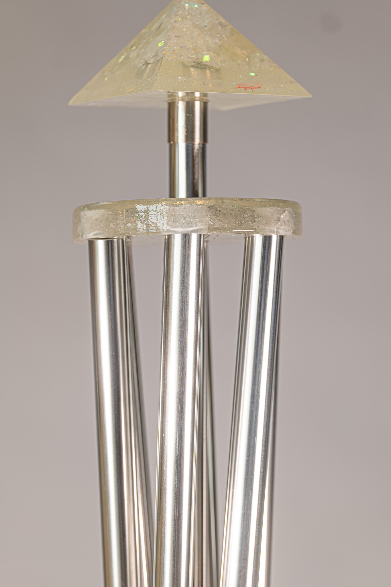 Das Gestänge: Sieben Stangen, die im hexagonalen Muster 1,65 m in den Himmel ragen, ummantelt von wetterfestem Schutz. Die zentrale Stange ist mit beschwungenen Bergkristallspitzen gefüllt.