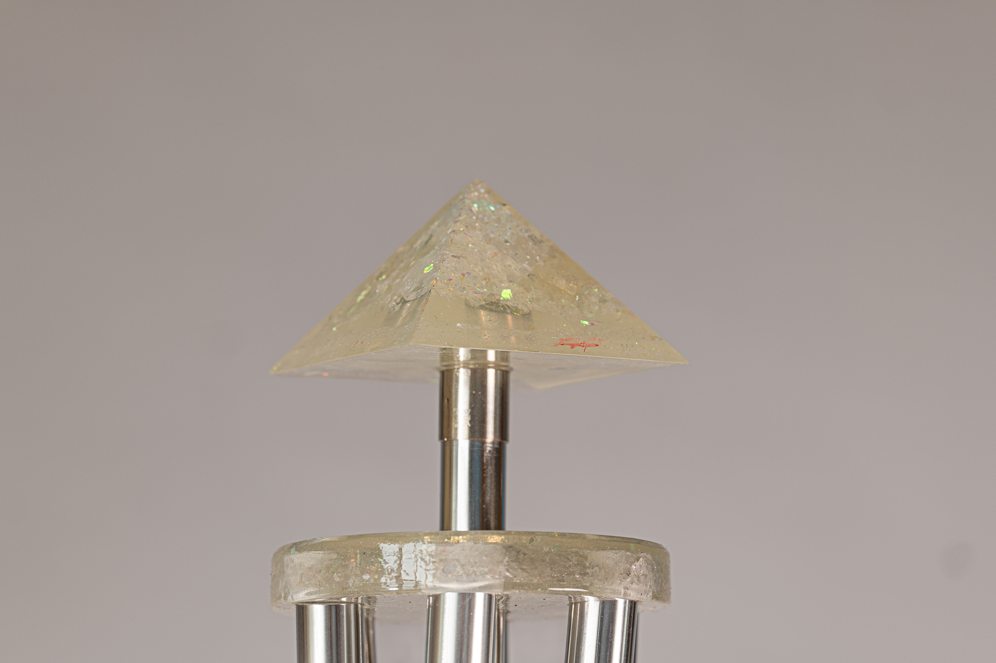 Die Spitze: Eine Cheopspyramide bildet den Abschluss, in deren Kraftpunkt ein informierter lemurianischer Kristall sitzt. Den höchsten Punkt markiert ein doppelendiger Herkimerdiamant für maximale Energiebündelung.