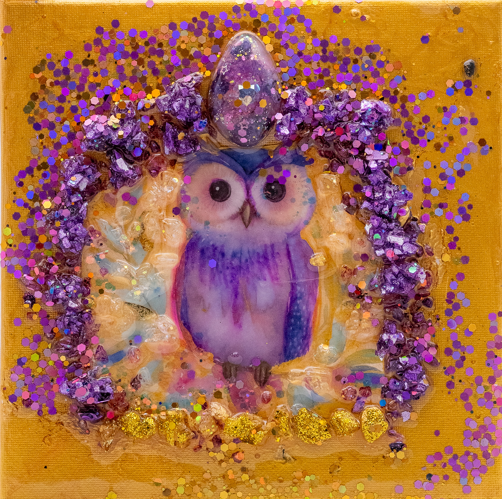 Eine mystische Eule im funkelnden Amethyst-Glanz. Eingebettet in violette Kristalle und goldene Akzente – ein Werk, das Schutz, Weisheit und innere Ruhe ausstrahlt. Teil der magischen Tierwesen-Serie.