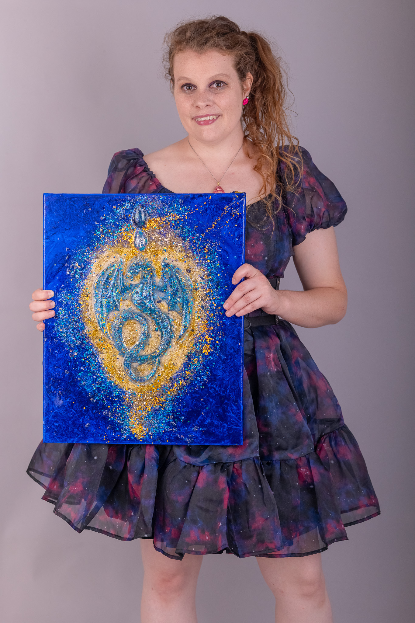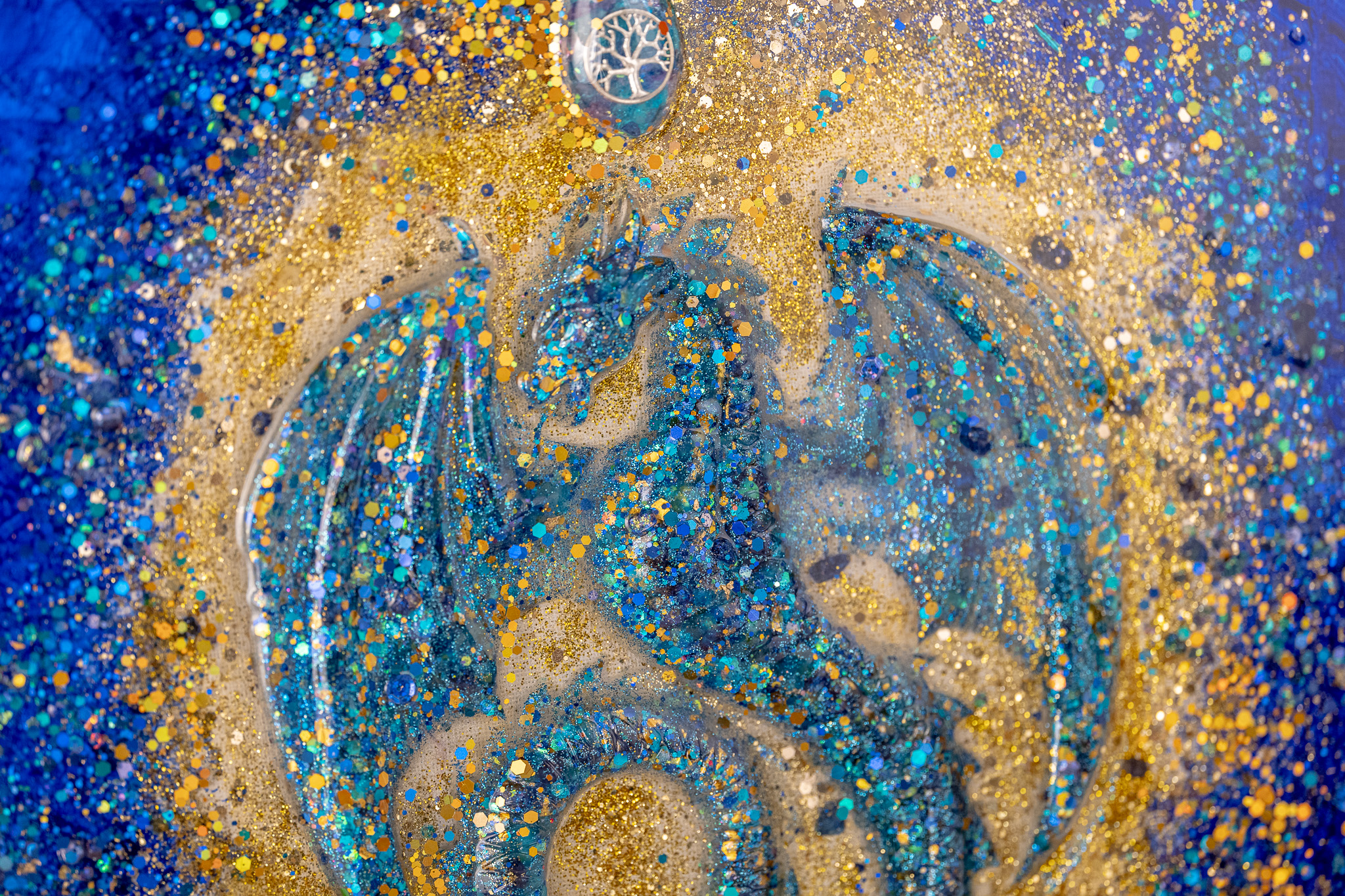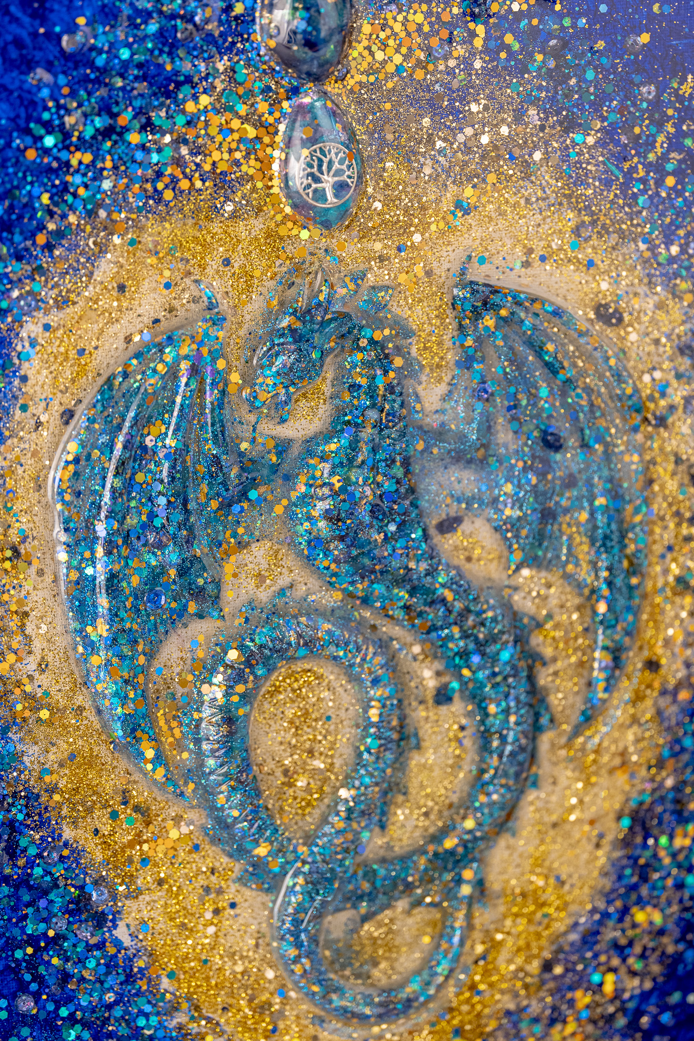 Dieses Gemälde wird zum faszinierenden Mittelpunkt eines jeden Raumes. Die dominierenden Farben von Aquamarin und dunklem Blau vermitteln die mystische Tiefe des Wassers, während schimmernde Silber- und Goldakzente die magischen Qualitäten des Drachens hervorheben.