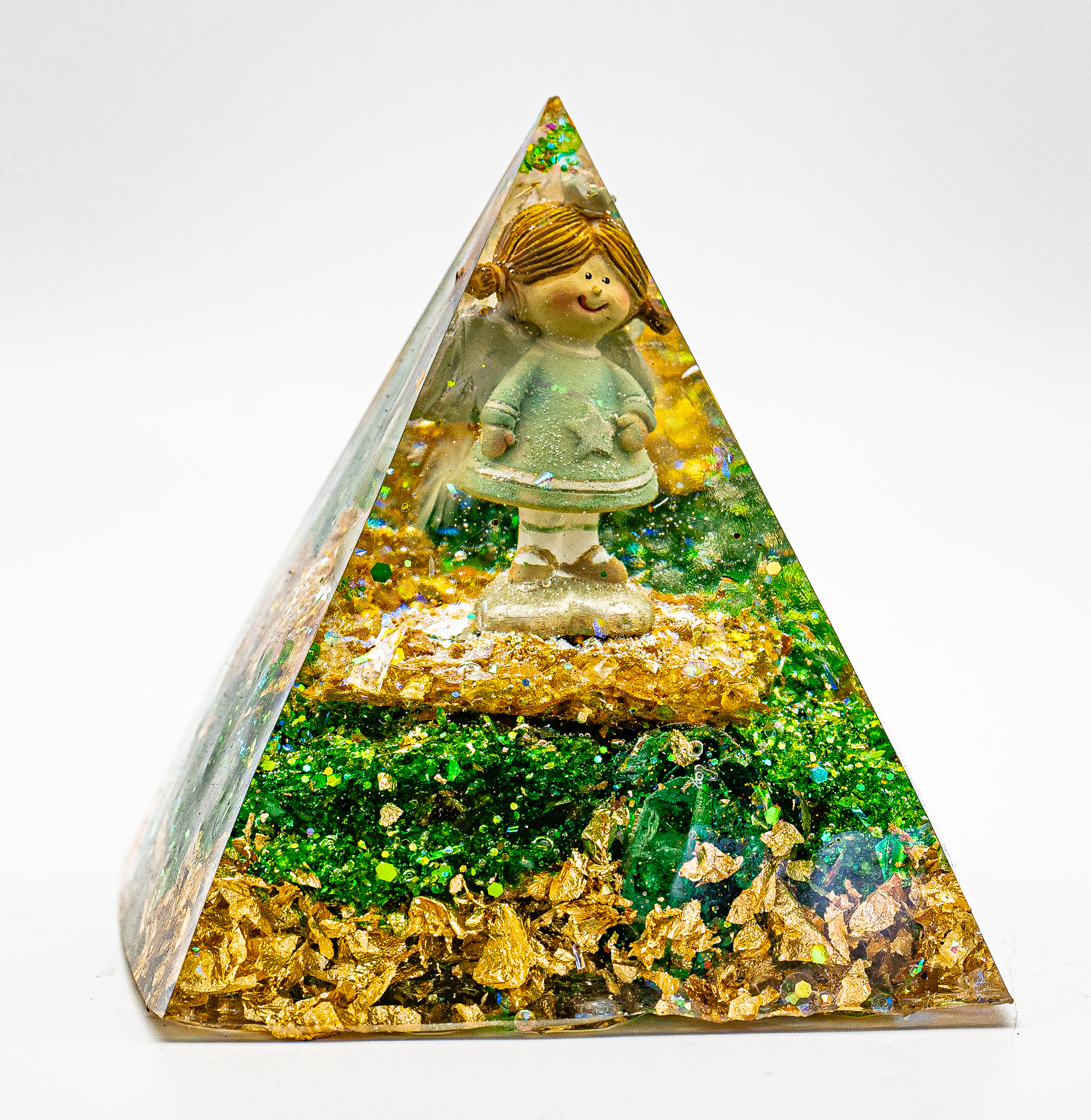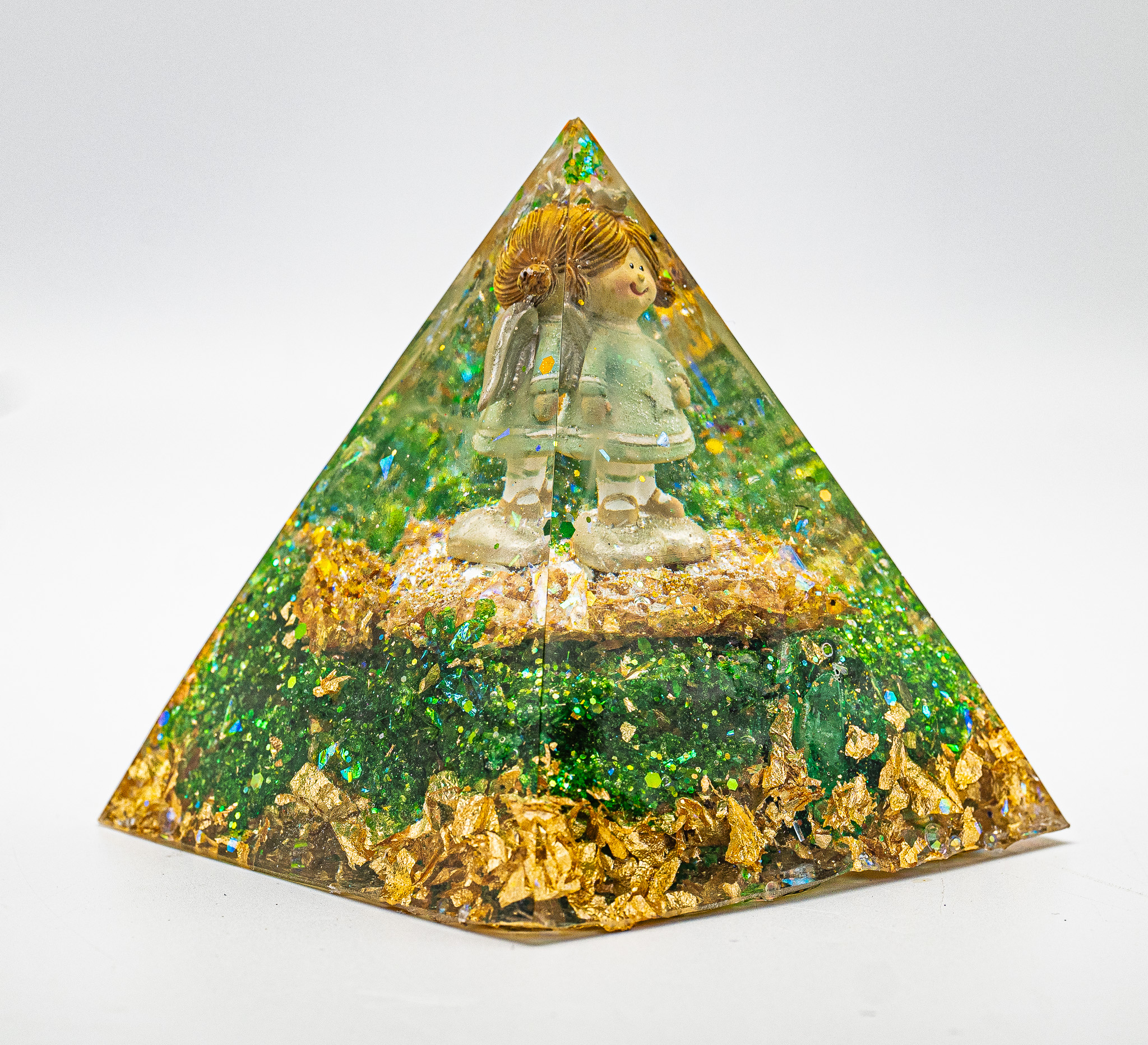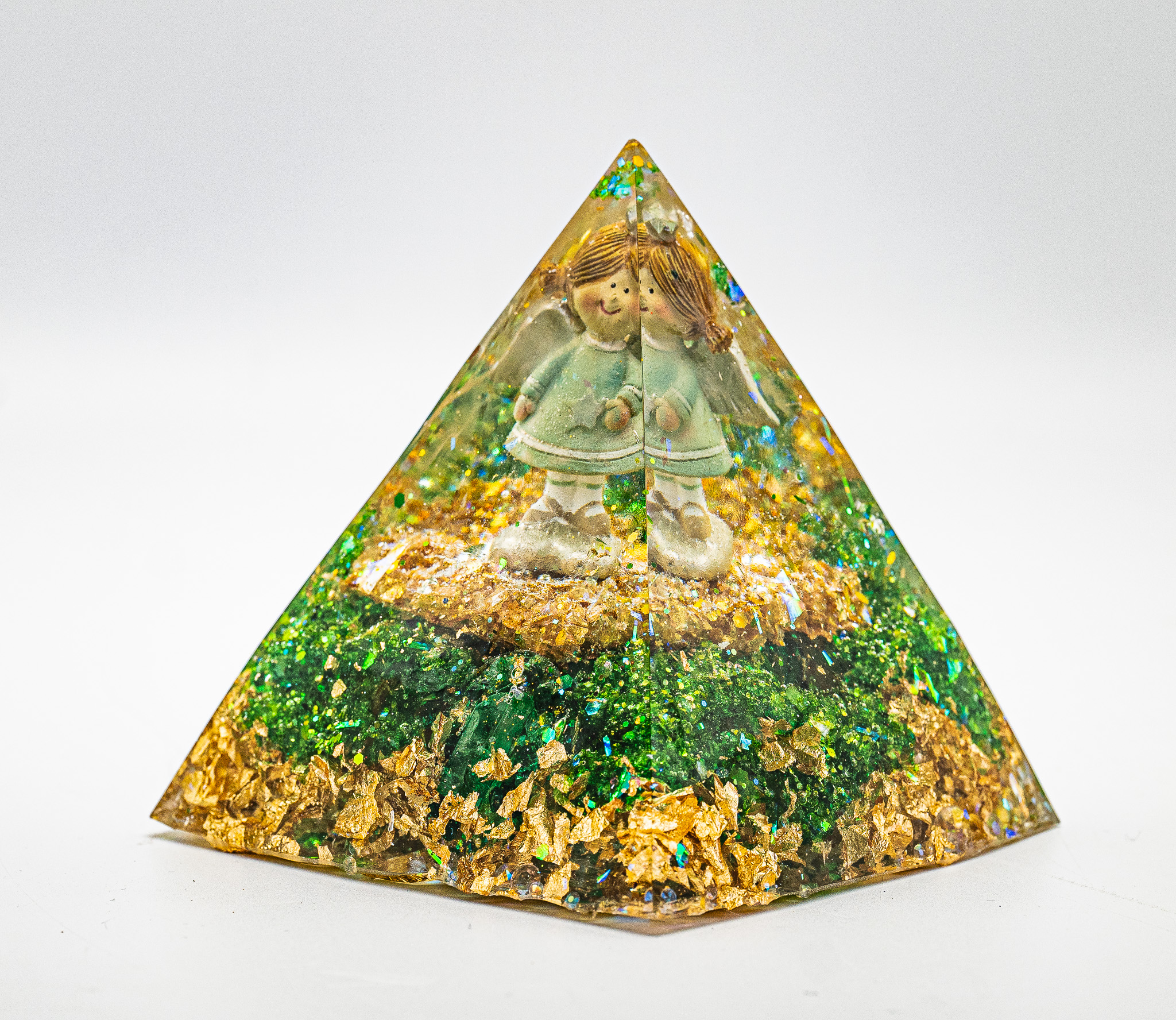 Goldene und grüne Lichtreflexe durchziehen die Pyramide und schaffen eine warme, lebendige Tiefe. Goldpapier und (teilweise gefärbter) Bergkristall reflektieren das Licht auf zarte Weise und lassen das Objekt je nach Blickwinkel weich schimmern. Die klassische Pyramidenform fasst den Engel wie einen kleinen, schützenden Raum.