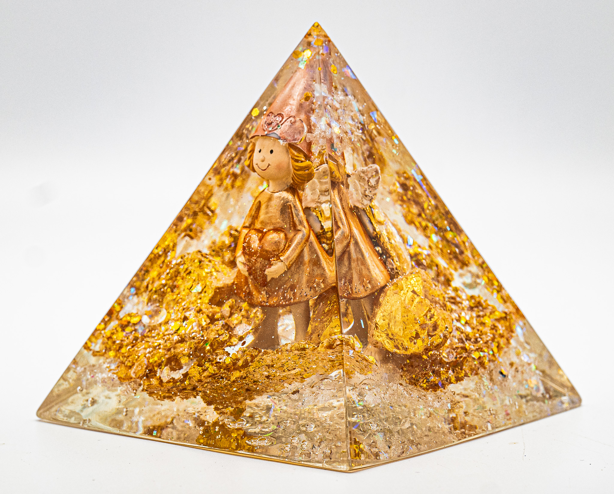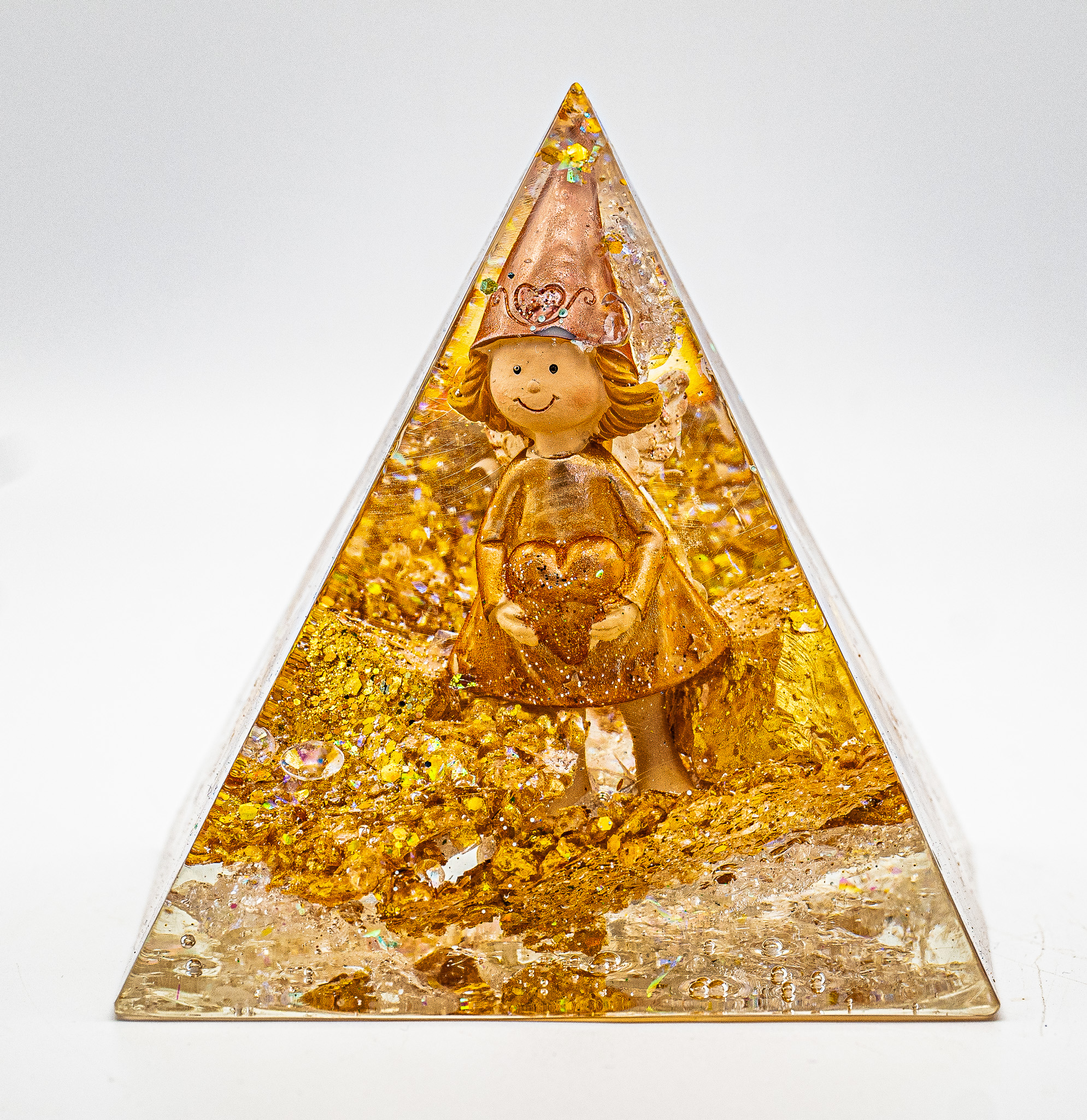 Die Pyramide Goldengel strahlt Wärme, Geborgenheit und sanfte Ruhe aus. Im Inneren steht ein kleiner Engel mit einem großen Herz in den Händen – still lächelnd, offen und freundlich. Seine Präsenz wirkt beschützend und liebevoll, ohne aufdringlich zu sein.