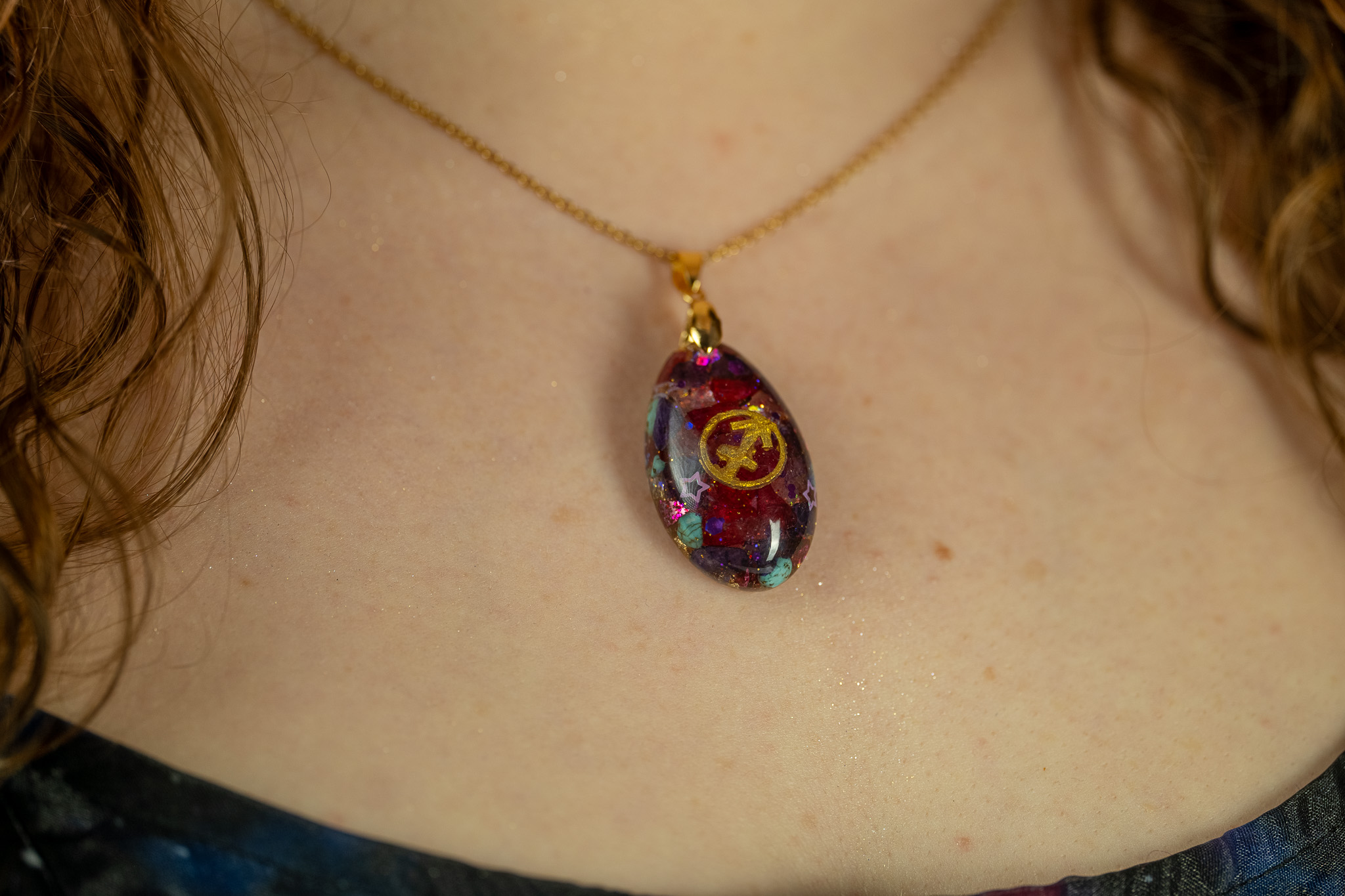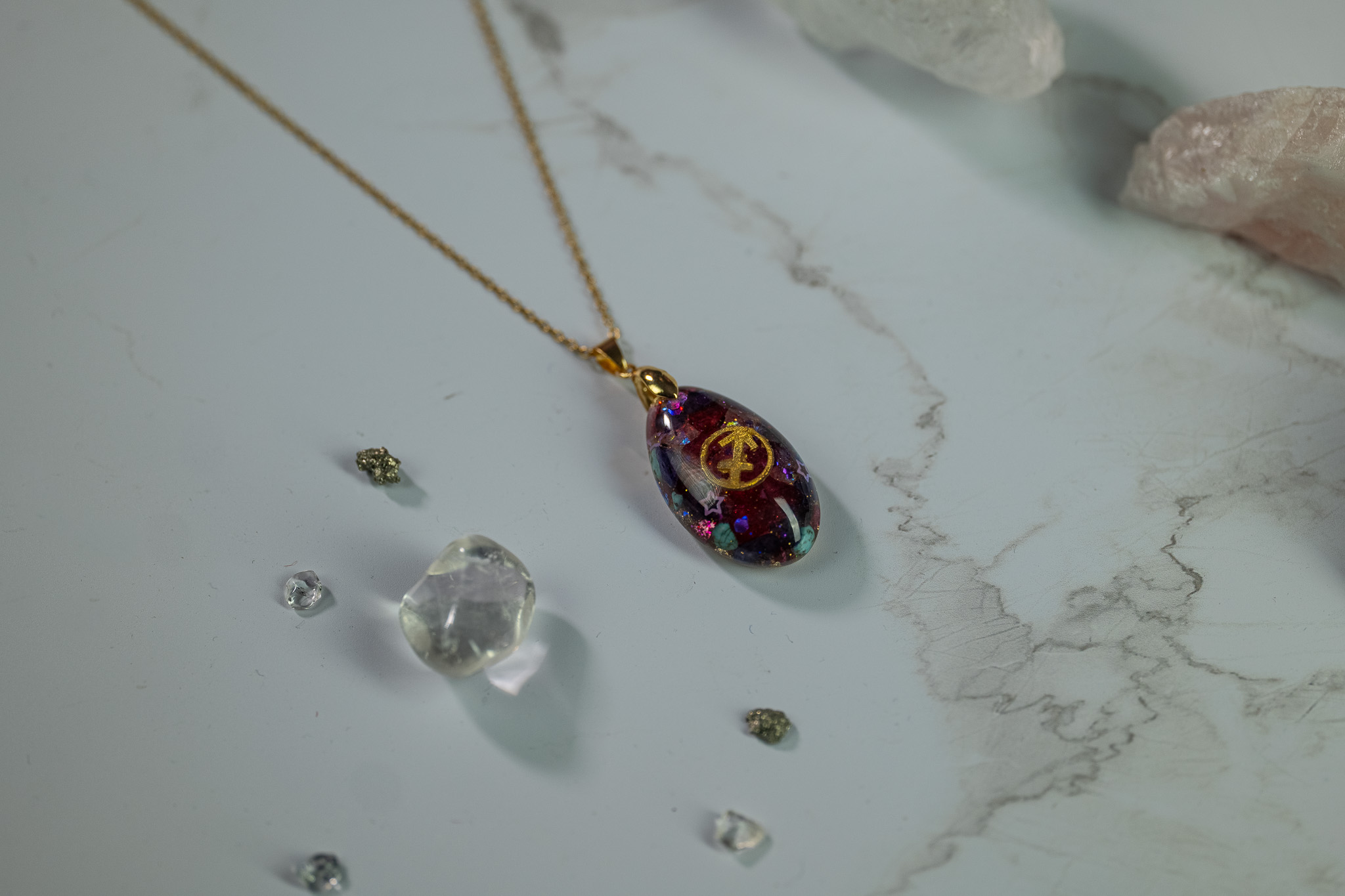 Neben dem Orgonit-Kern im Anhänger wurde ein sogenannter „Gleichgewichts-Stein“ eingebaut, der als ausgleichende Qualität für das jeweilige Sternzeichen dient.