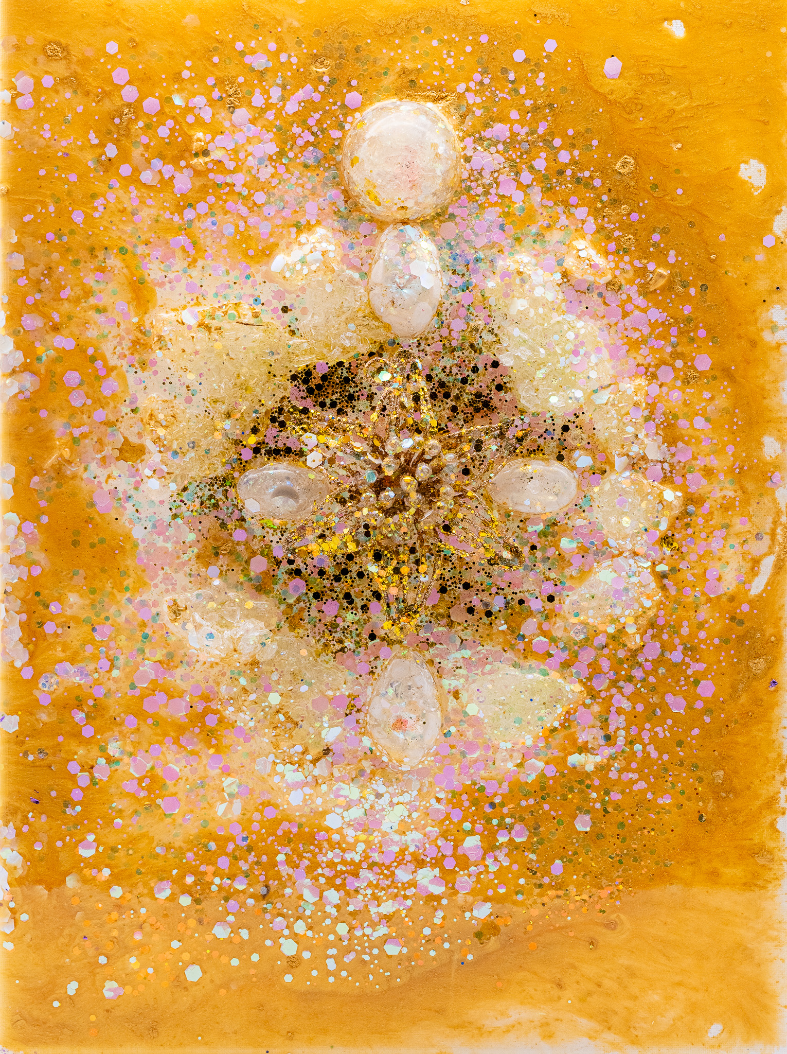 Eine goldene Explosion aus Licht, Farbe und Struktur. Dieses Werk erinnert an die Entfaltung einer Sonnenblume aus purer Energie – mit opalweißen Steinen und feinem Glimmer, der das Licht einfängt und streut.