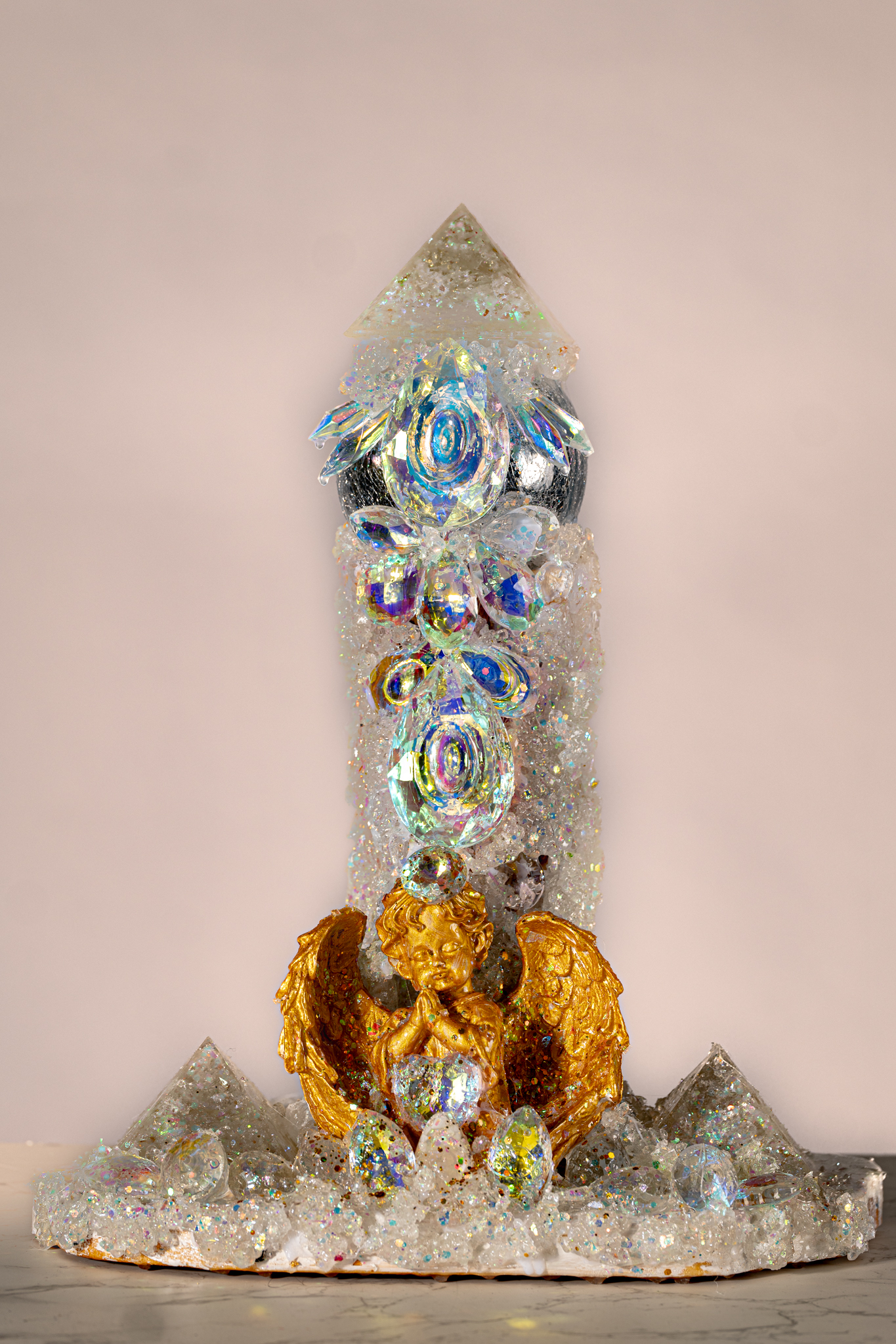 Die Orgonitstatue „Erleuchtung“ ist ein kraftvolles Symbol für Bewusstwerdung, innere Ausrichtung und die Rückkehr in das eigene Licht. In ihrer Mitte ruht ein goldener Engel, beschützend und lichtvoll, geziert von einem weißen Pranakristall und schimmernden Pranatropfen, die das Licht vielfach brechen und verstärken.