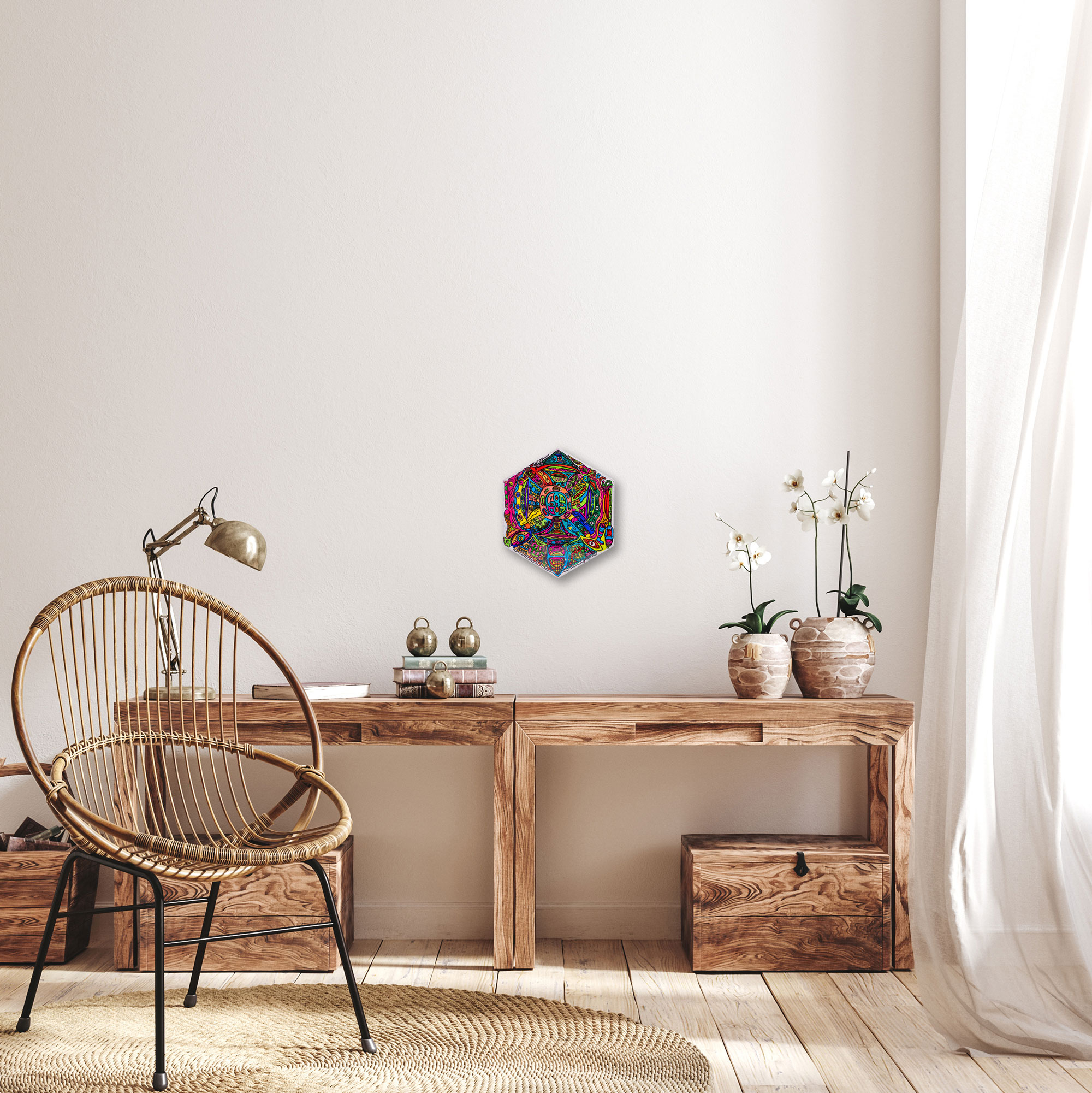 Ein sechseckiges Werk voller geometrischer Präzision und psychedelischer Lebendigkeit. Es symbolisiert das Zusammenspiel von Technik, Bewusstsein und Schöpfung – eine Art energetische Landkarte zwischen Körper und Geist.
