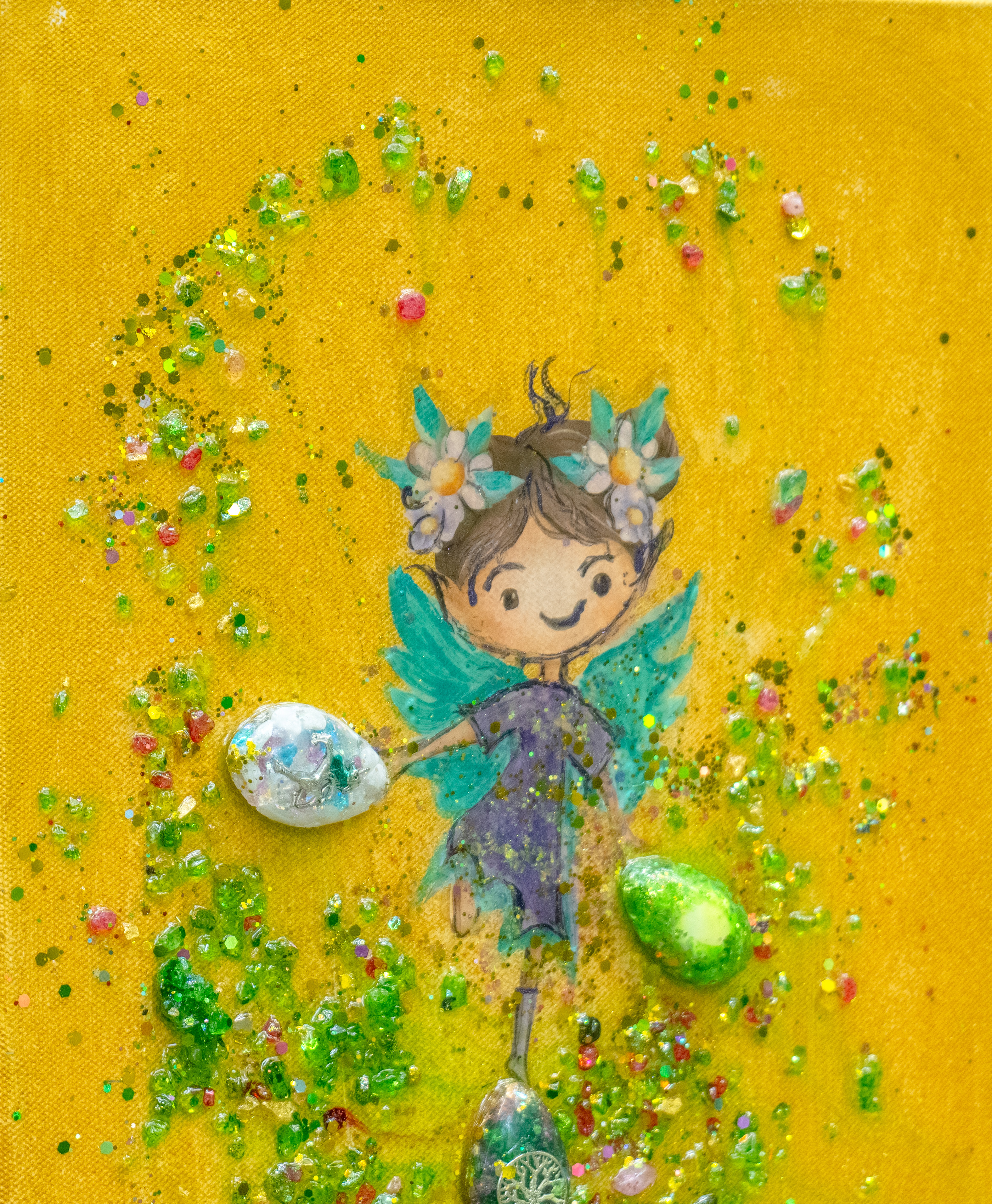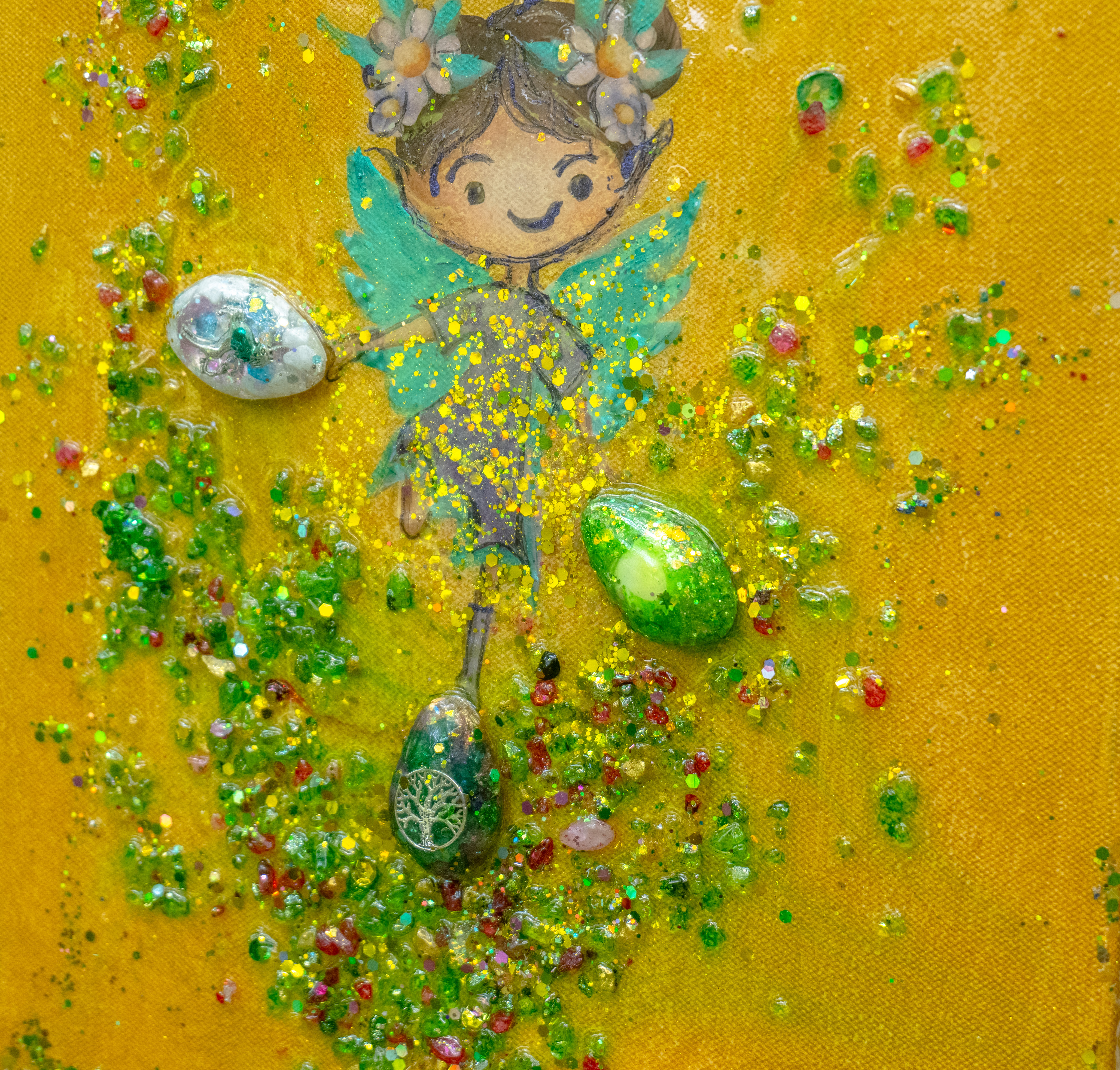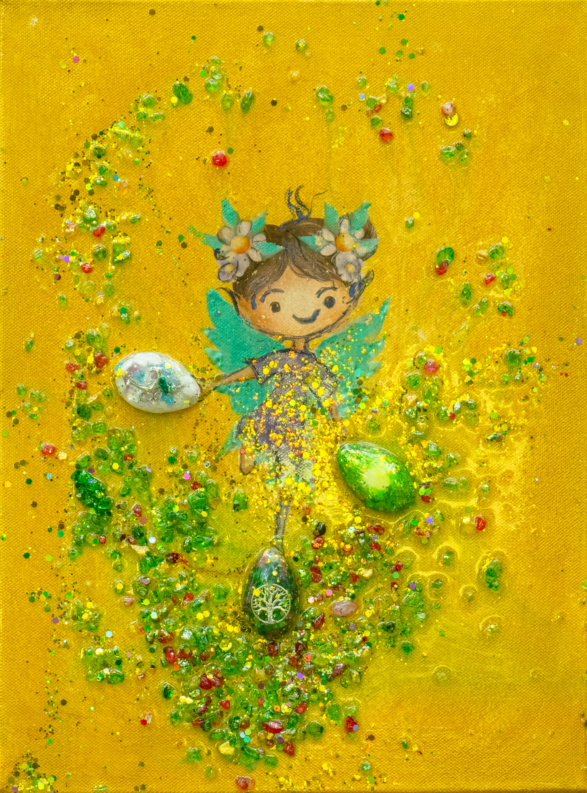Diese bezaubernde Waldfee tanzt inmitten von Glitzer, Edelsteinen und sonnengelber Energie – ein handgemachtes Unikat voller Magie, Lebensfreude und liebevoller Details.