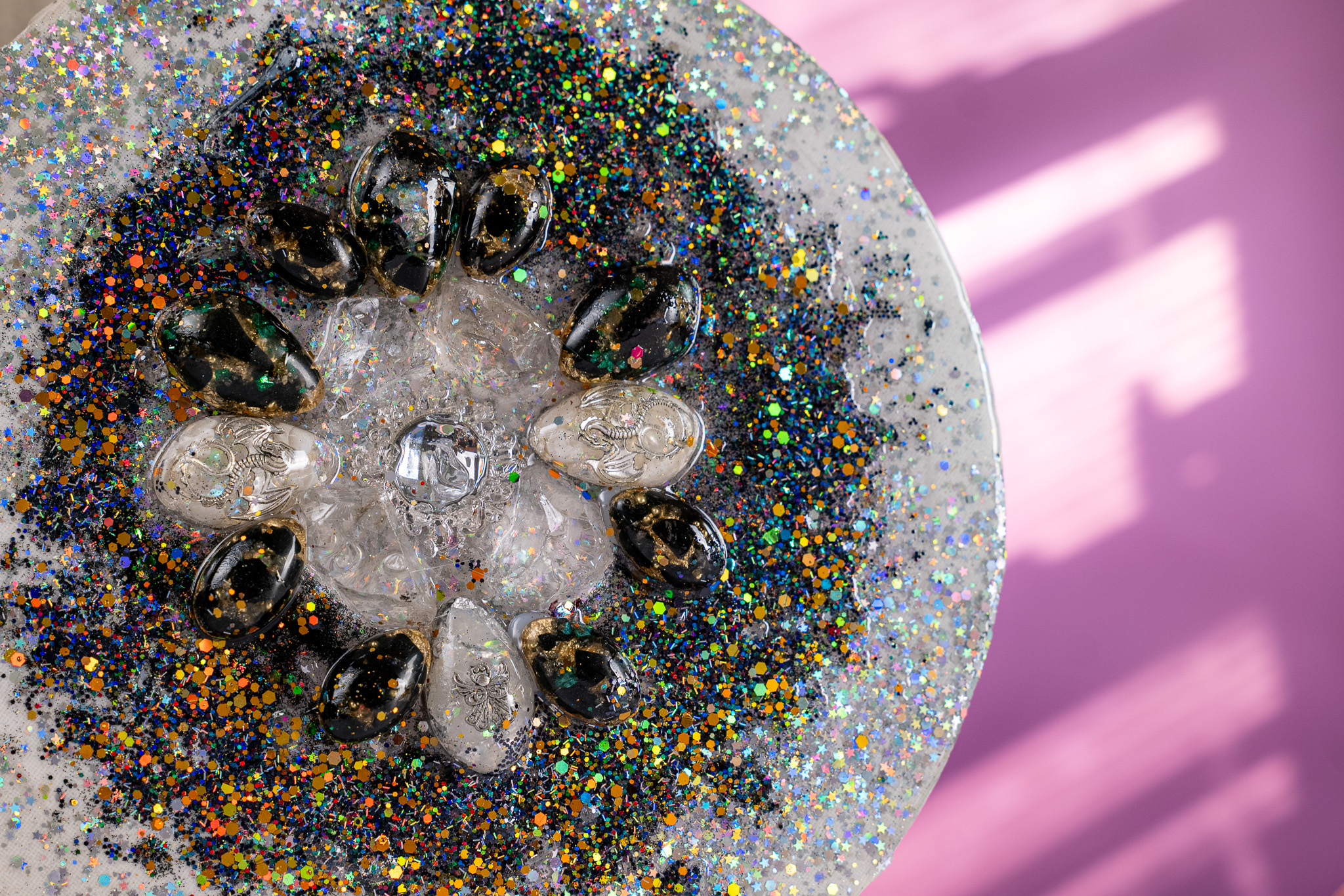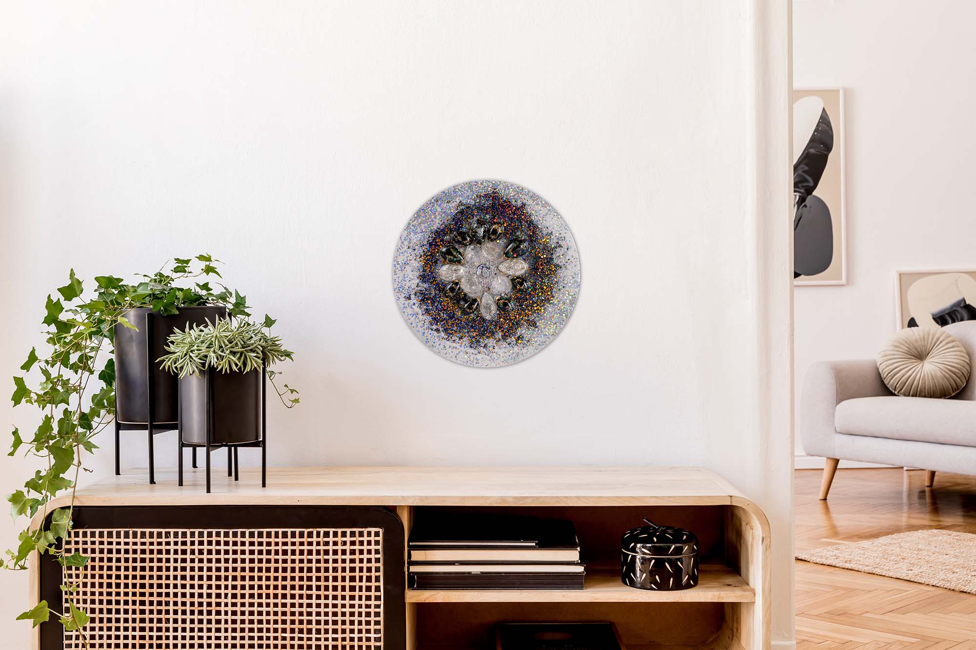 The piece consists of a unique combination of gemstones, resin, and acrylic paint. The gemstones were carefully selected to transform the artwork into a brilliant blend of colors and textures. The rich, vibrant colors were achieved through the use of acrylic paint, while the resin adds extra depth and dimension.