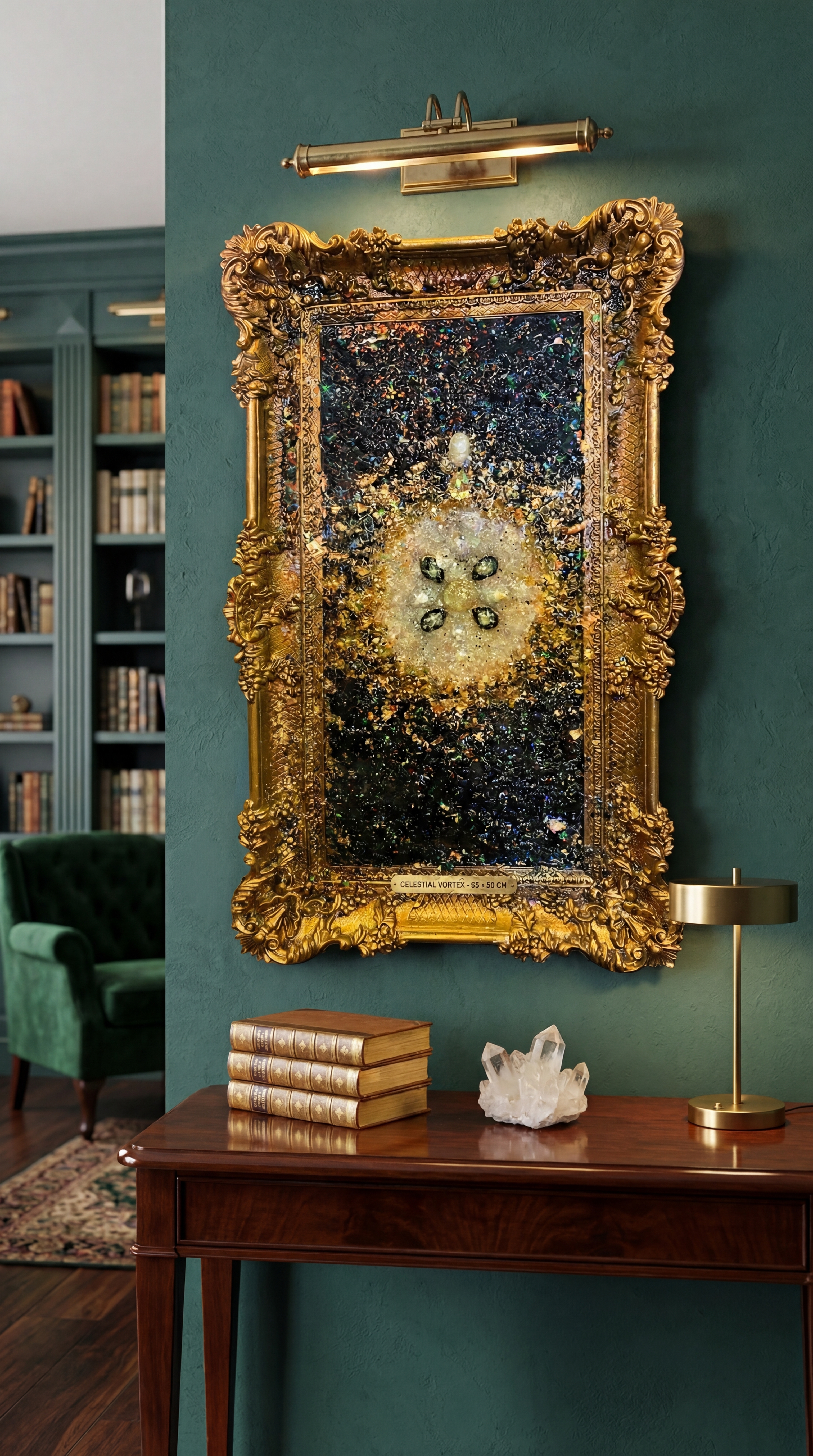Materials: Resin, acrylic paint, gemstones, Pranadrops