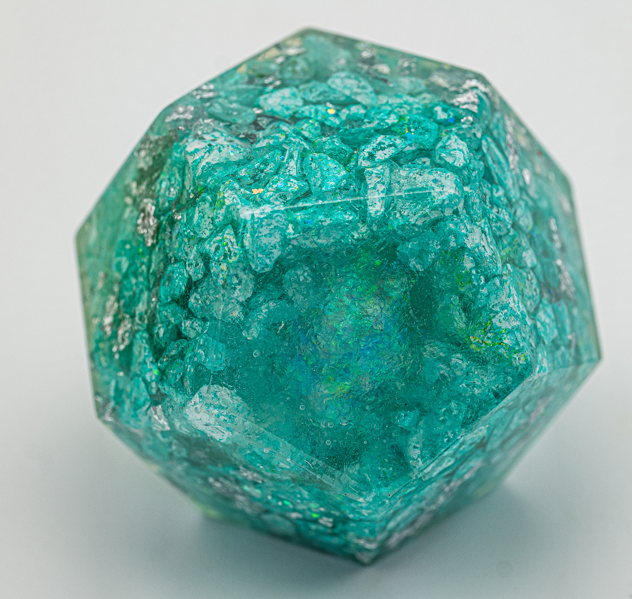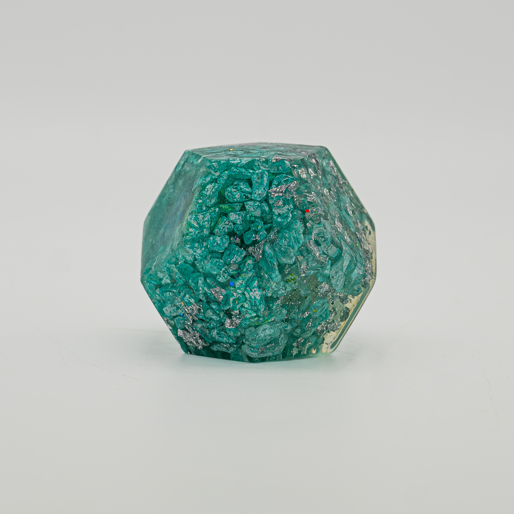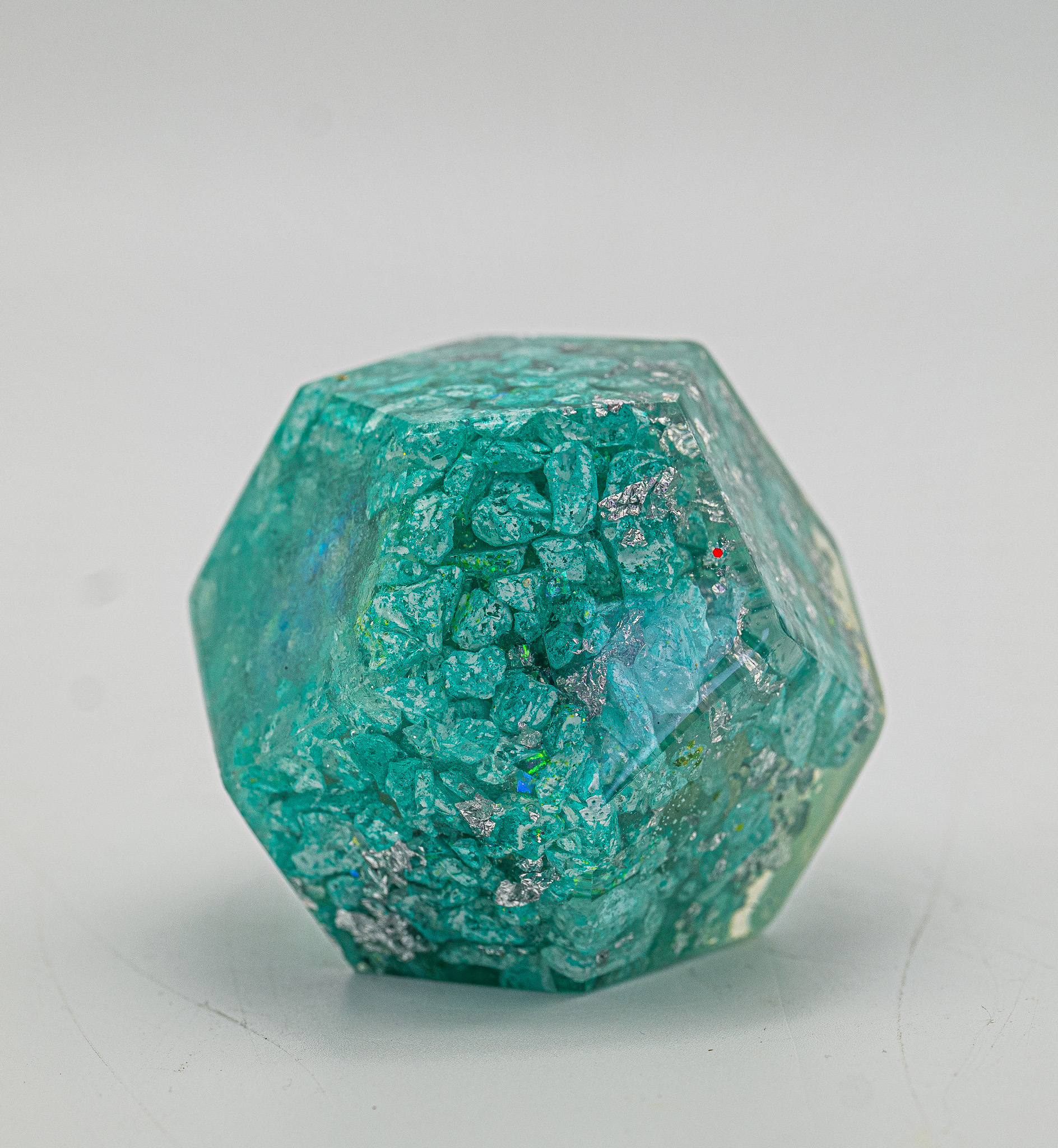 Das organische Harz zieht Energie aus der Umgebung an. Beim Aushärten schrumpft es und erzeugt konstanten Druck auf die eingebetteten Metalle und Kristalle – ein piezoelektrischer Effekt, der das Energiefeld aktiviert.