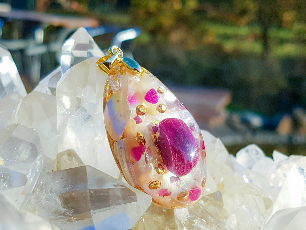 When worn on the body, Pranadrops® act as a harmonizer for the aura. They consist of orgonite, which is a compound of resin, gemstones, and noble metals. Orgonite absorbs stagnant energies (DOR), purifies them, and subsequently ejects positive energy (Orgon). Pranadrops® are the ideal companion for on the go, at work, or at home. They create a well-balanced aura and help generate harmony in everyday life. Orgonite pendants do not require intensive care. Holding them under flowing water once a week for five minutes is enough to energetically cleanse them.
