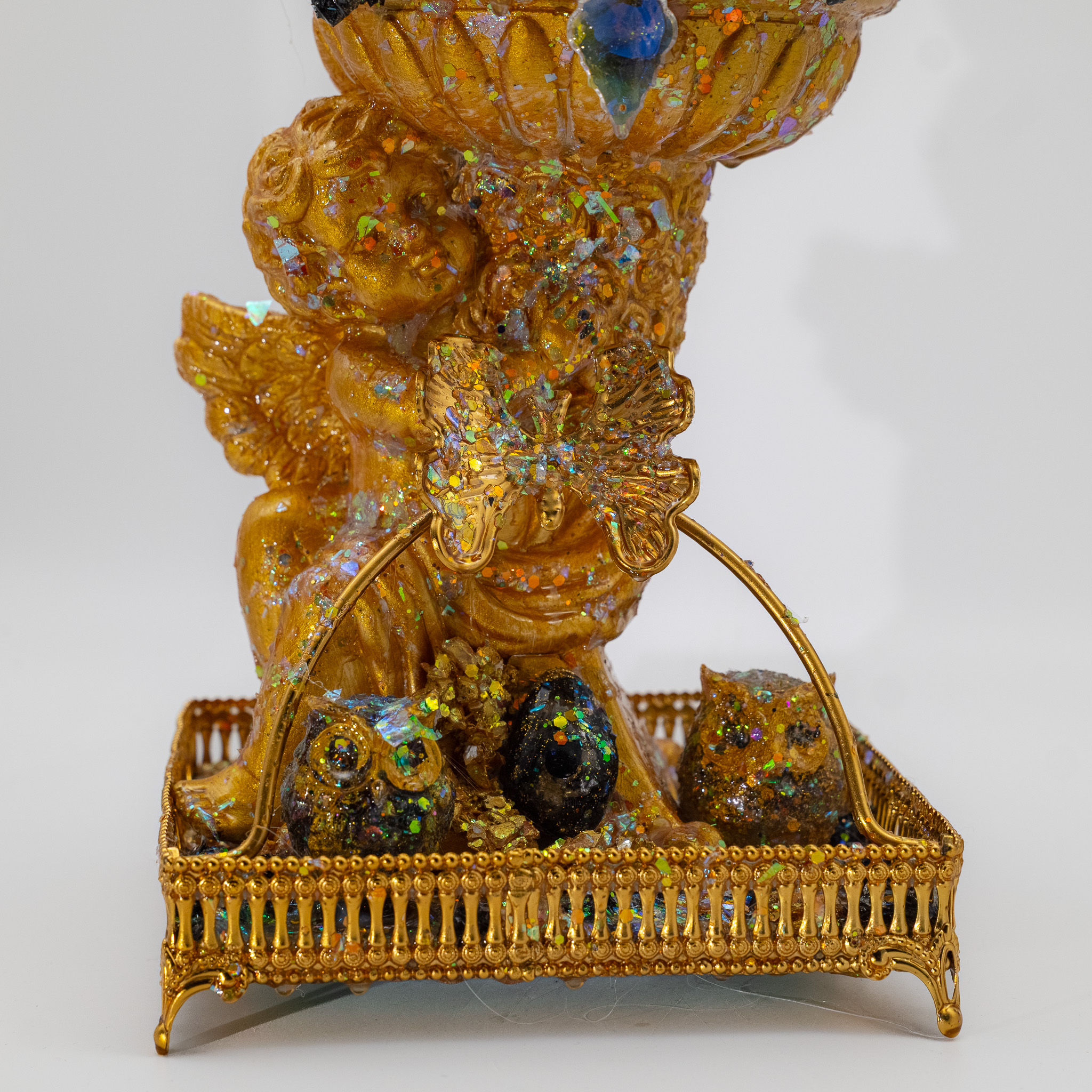 The latest creation from the Oz Orgonite workshop is an abstract artwork symbolizing the energy of eternal youth. The statue is painted in vibrant green, pink, blue, and golden hues representing eternal youth, and adorned with orgonites and gemstones such as clear quartz, citrine, and gold leaf. All gemstones have been alchemically charged and possess high energies. It is set on a stone base and decorated with many additional gemstones. The sheer sight of it radiates a fascinating and divine power.