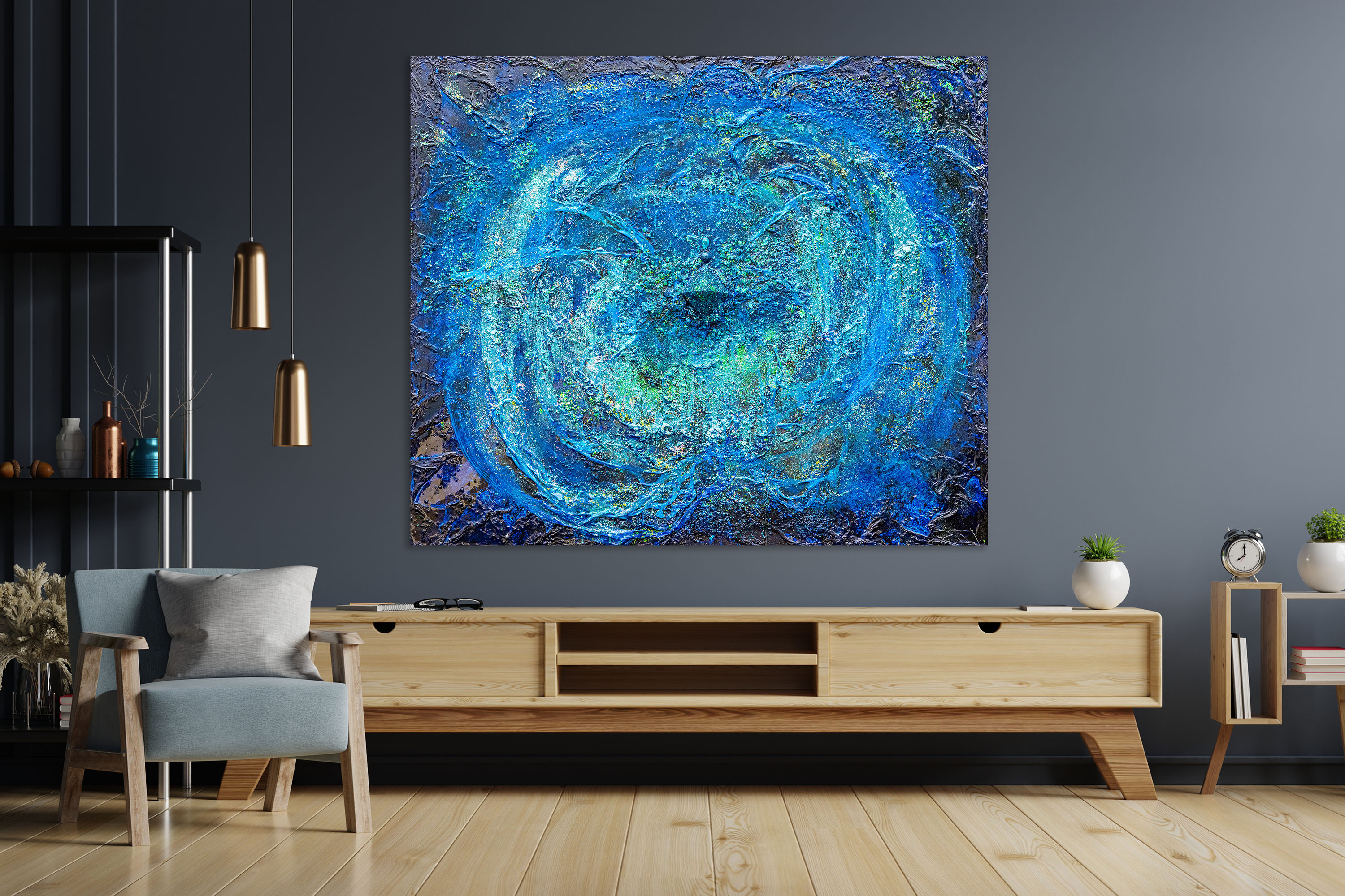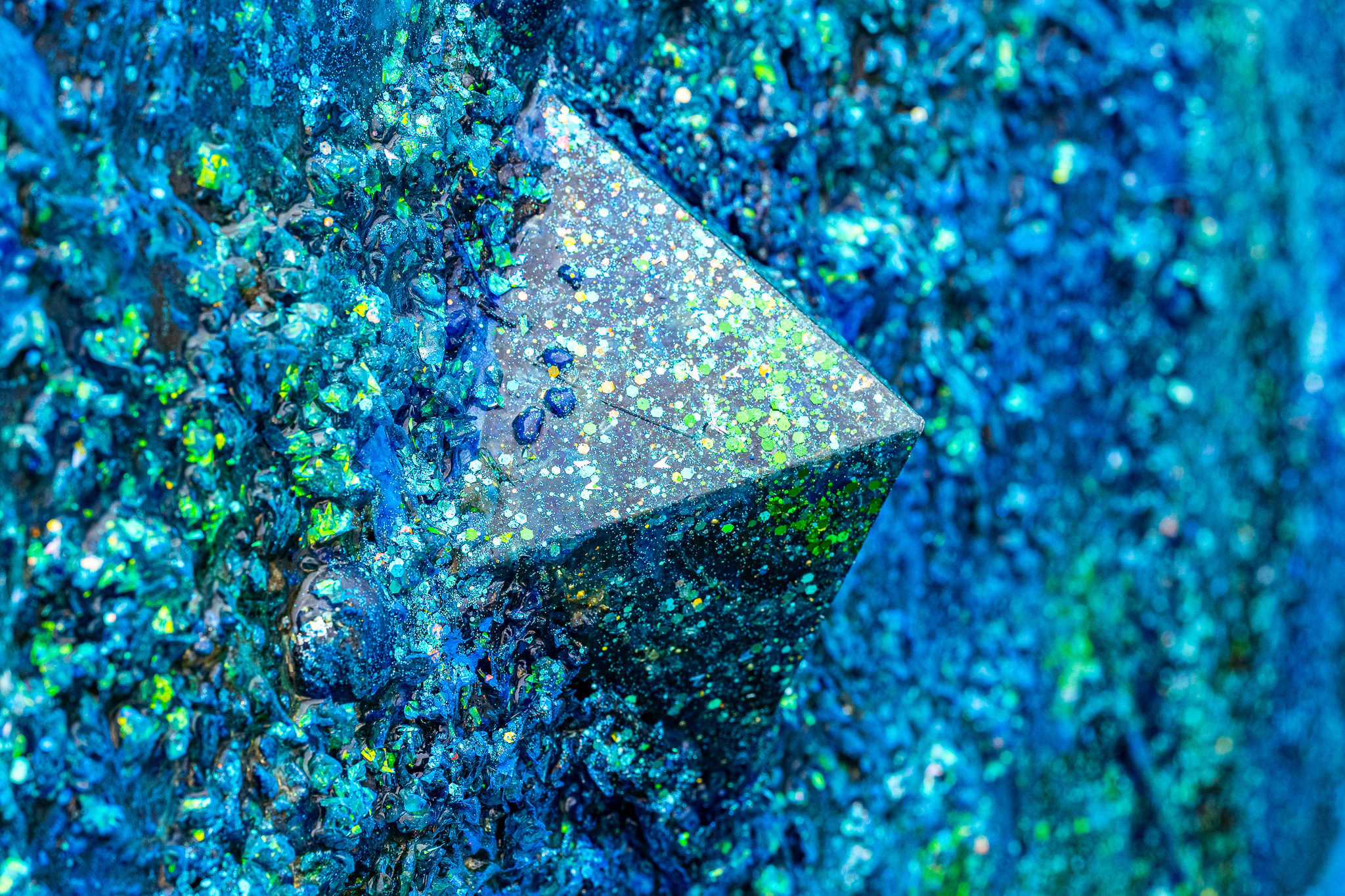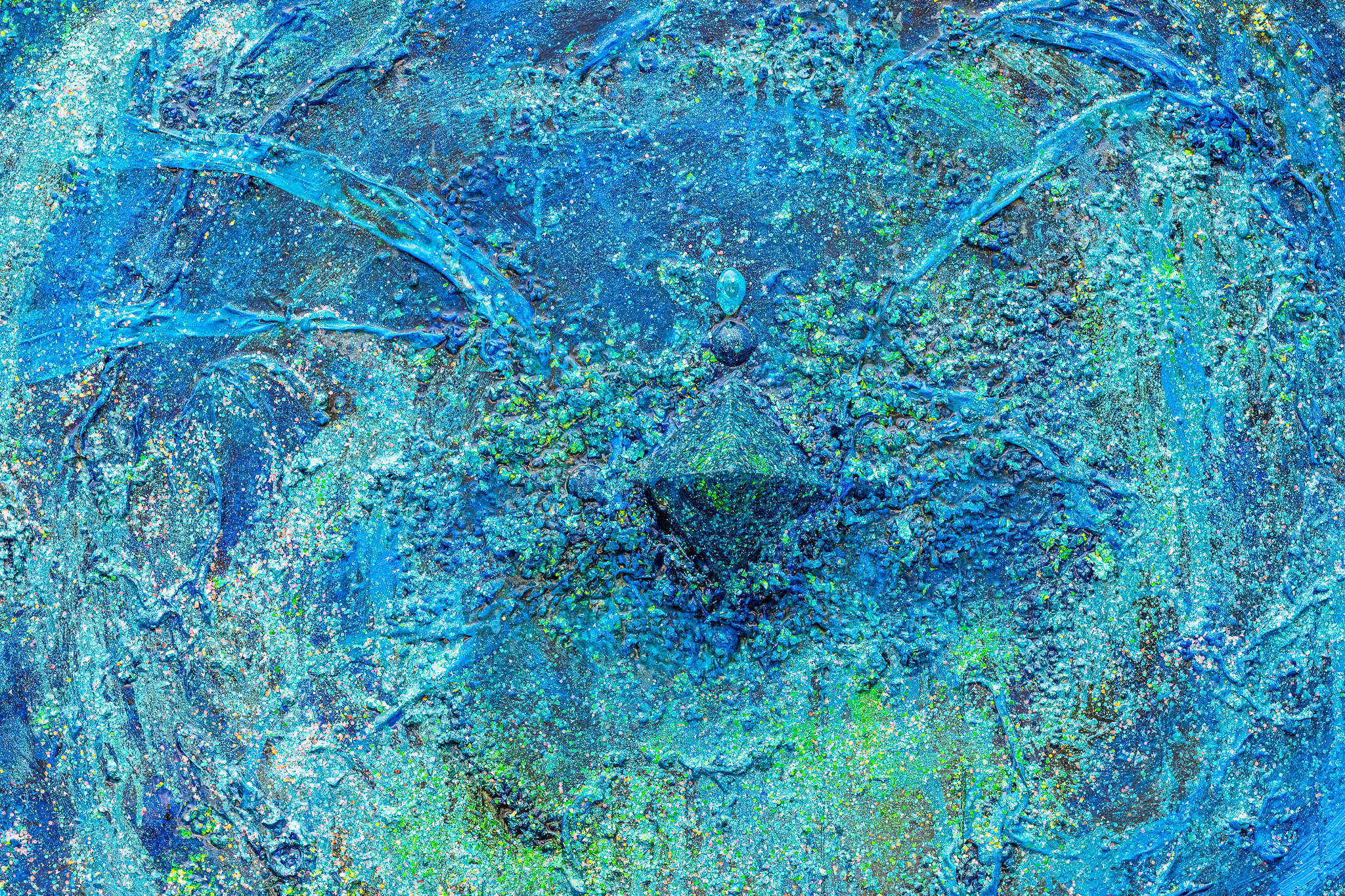 This incredible artwork, with its beautiful blue tone combined with turquoise spirals converging on the pyramid in the center, represents the all-encompassing energy that flows through the universe and connects us to a deeper reality. It is almost magical how each time you observe it, you can discover new nuances that evoke an atmosphere of meditation and self-reflection. Gemstones such as lapis lazuli, Herkimer diamonds, and clear quartz were used in combination with a unique resin casting technique, which has become a trademark of Donna McCain's style.