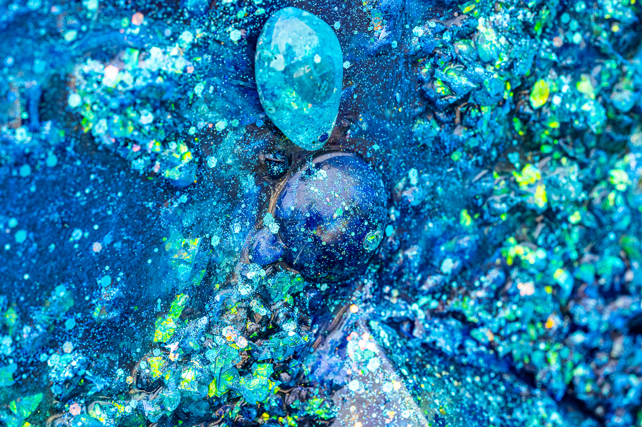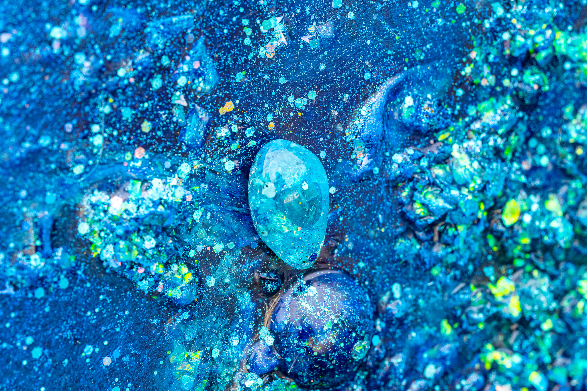 Materials: Resin, acrylic, gemstones, lapis lazuli, azurite, clear quartz, and many other high-quality gemstones, various metals, orgonites