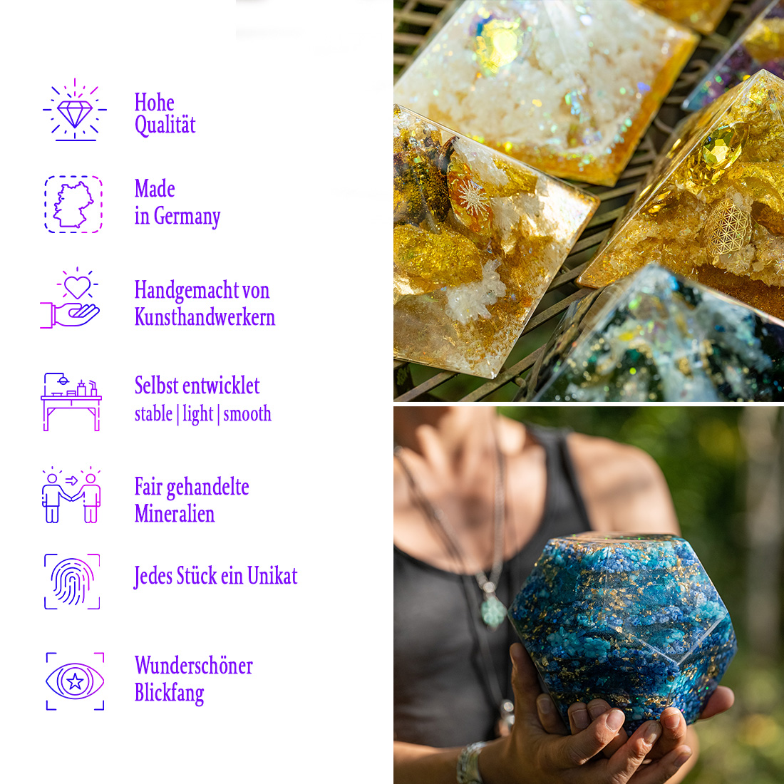 Wir verwenden echte Edelsteine, Kupfer, Silber und Gold – keine Eisenspäne. Jeder Orgonit wird von Hand gefertigt und energetisch vorbereitet.