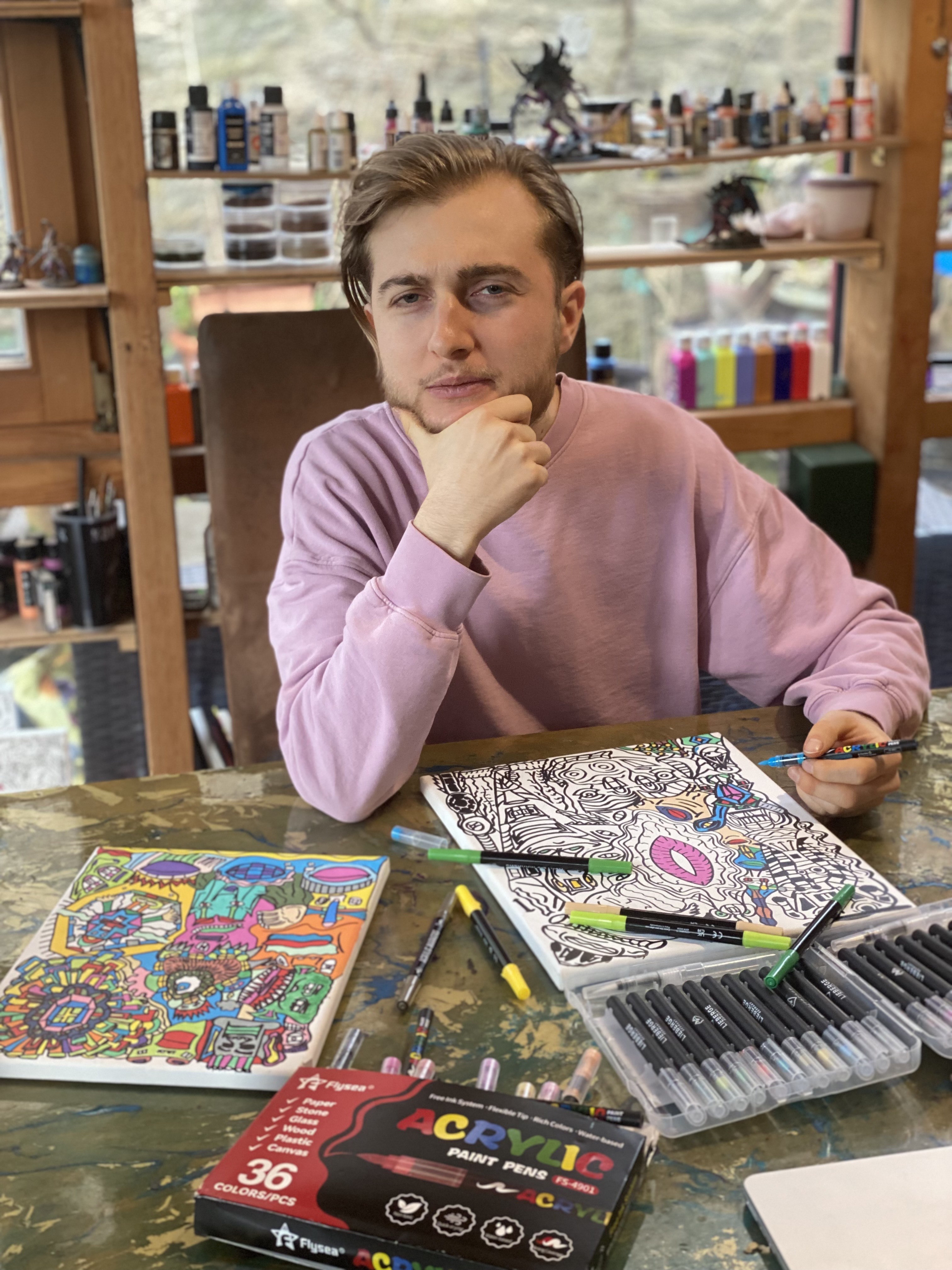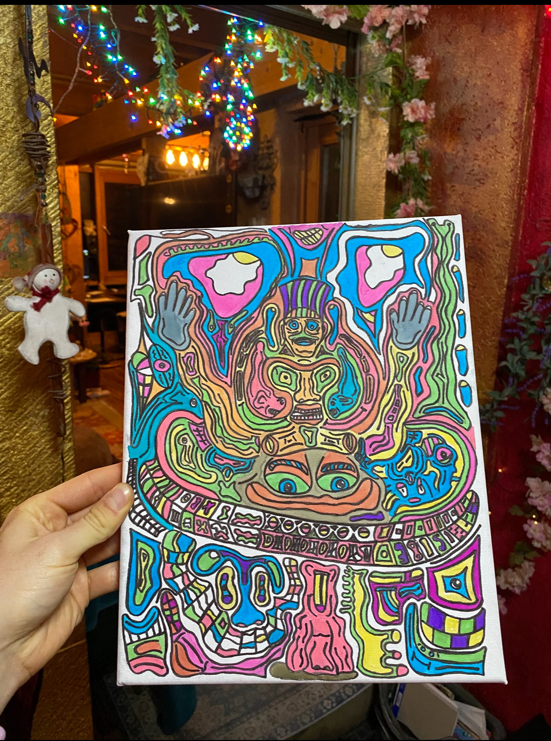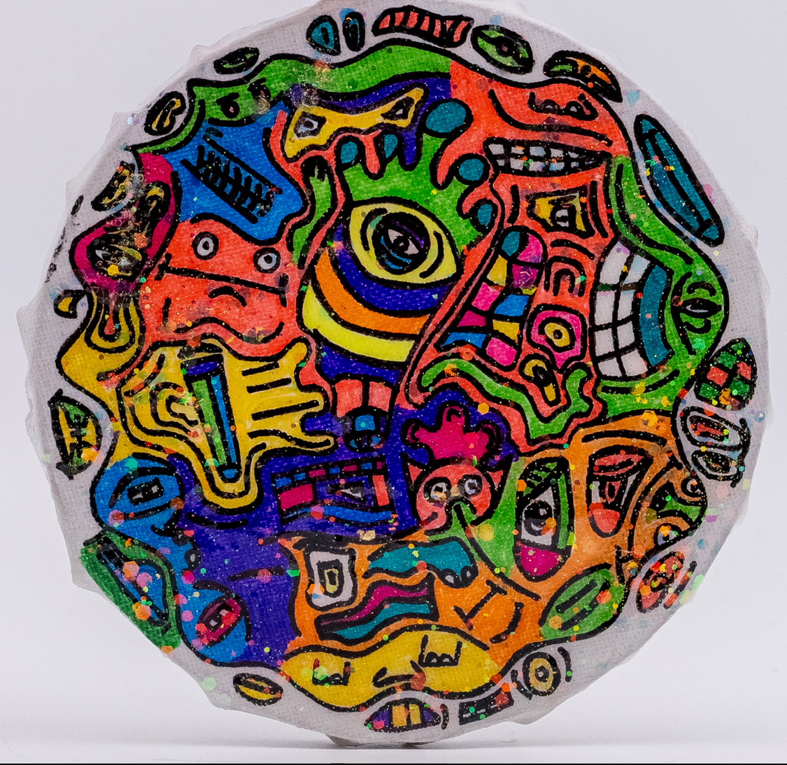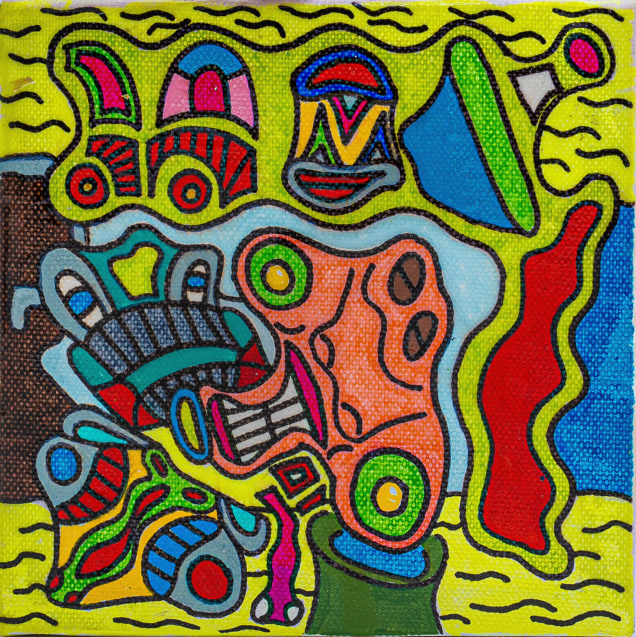 Leuchtende Farben in einem dichten, labyrinthartigen Muster. Dieses Werk wirkt wie ein elektrischer Gedankenstrom – ein Tanz aus Energie, Symbolik und freien Formen. Ideal für alle, die das expressive Chaos lieben. Maße: ca. 15cm x 15cm